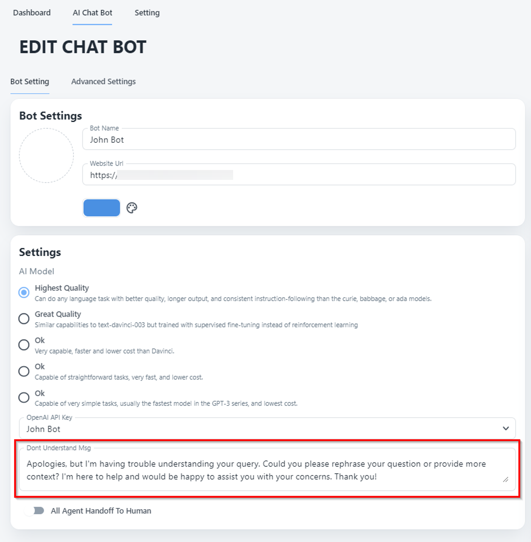 2. Click on "AI Chatbot" in the left menu bar to access the chatbot section.