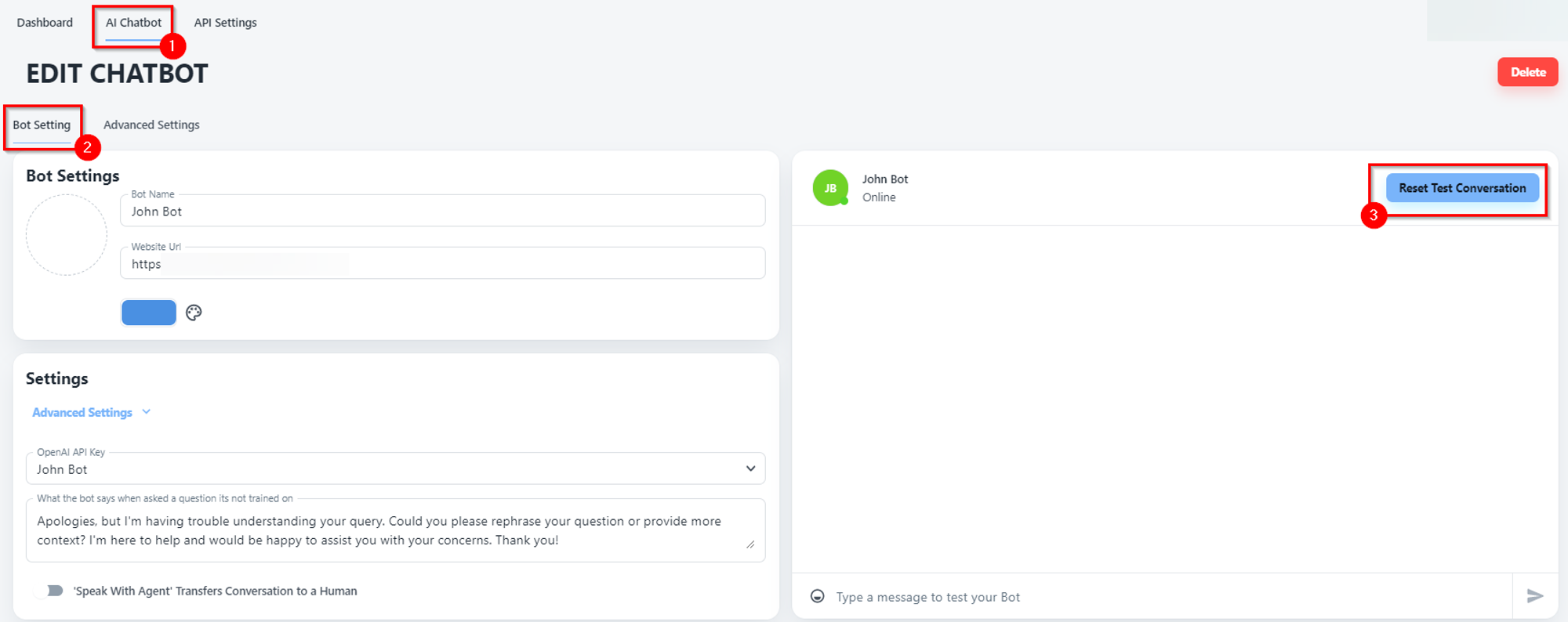 While talking to a chatbot, "Reset Test Conversation" refers to the process of resetting or creating a new conversation with the chatbot. This can be done for various reasons, such as: