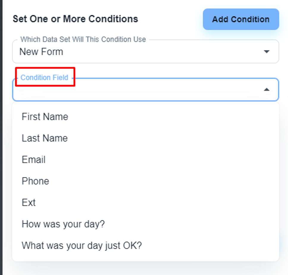 At the ‘Condition’ field dropdown, you can access all the available fields on the form.