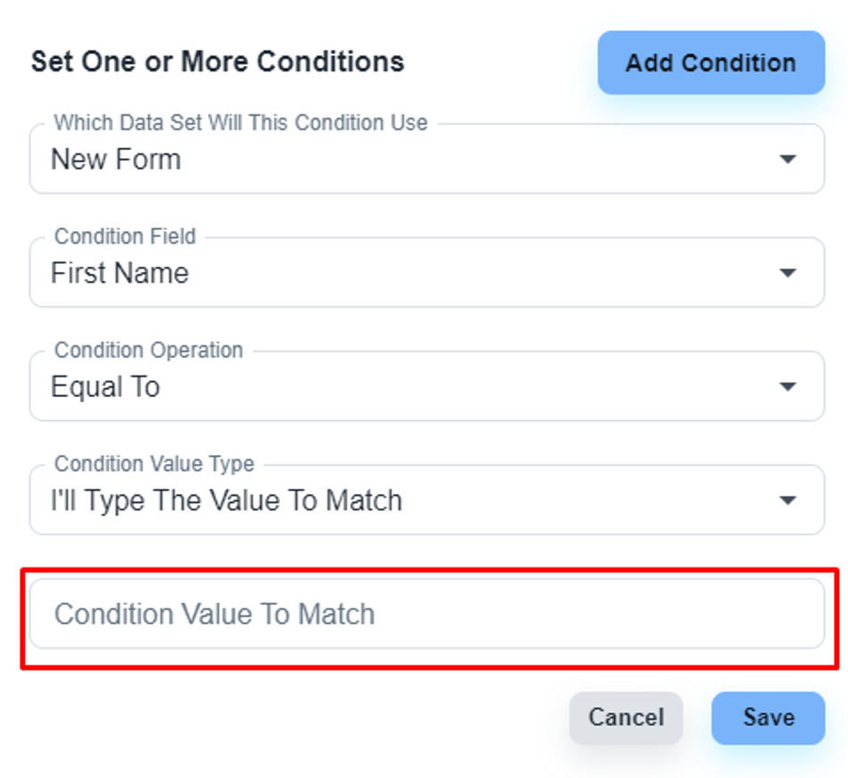 Please, select the first dropdown ‘Which Data Set Will This Condition Use’. At the very bottom, you will get the connected form with the flow.
