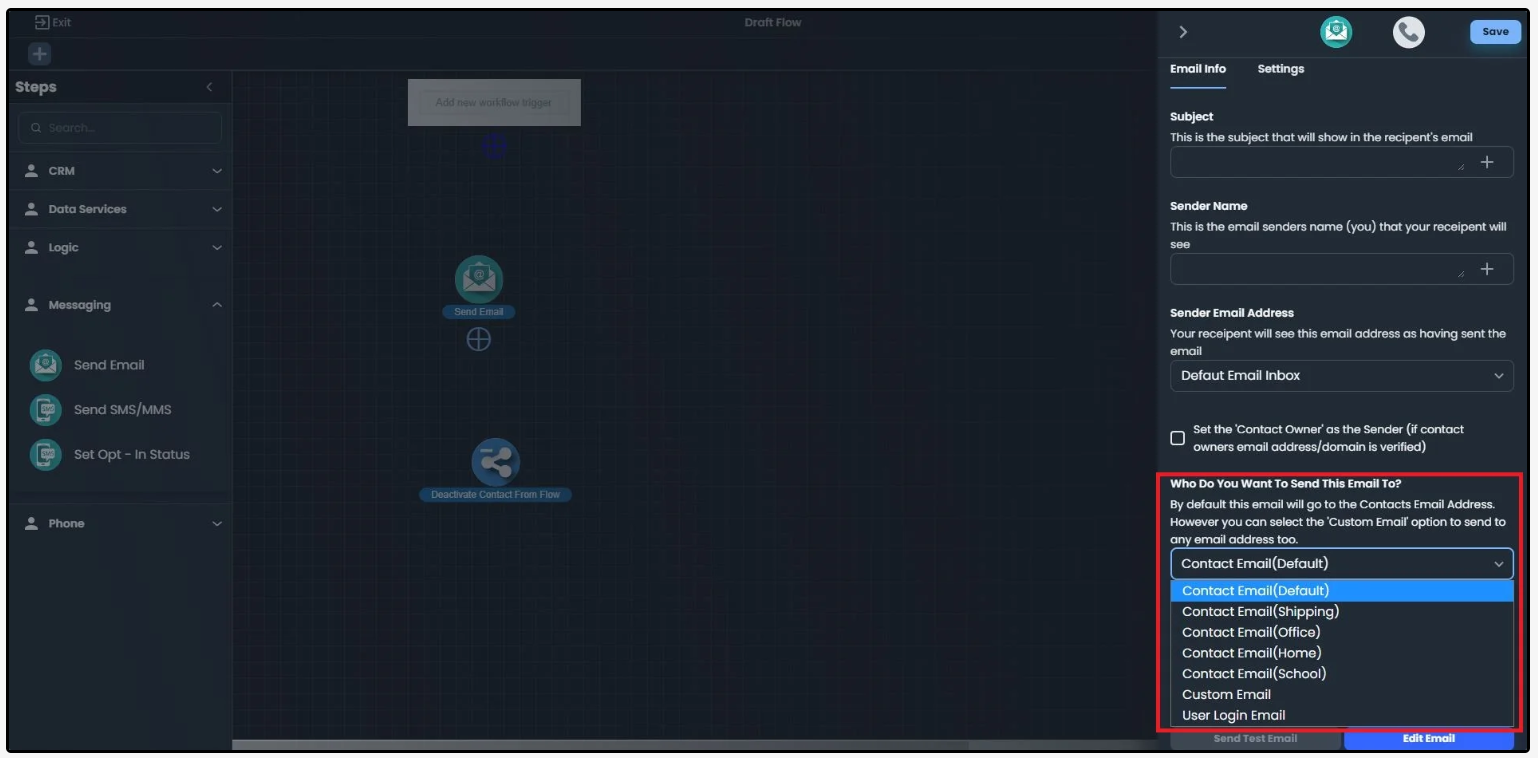 Under the "Messaging" section, drag and drop "Send Email" step. The system will allow you to configure that step.