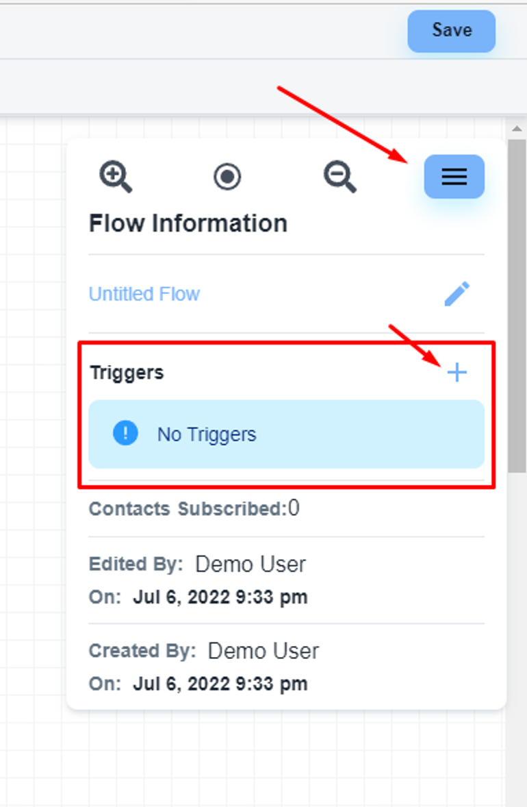 On the right side of the screen, you will have the hamburger icon to change the settings of the flow. Please, click on it. You will have the option to remove/add trigger
