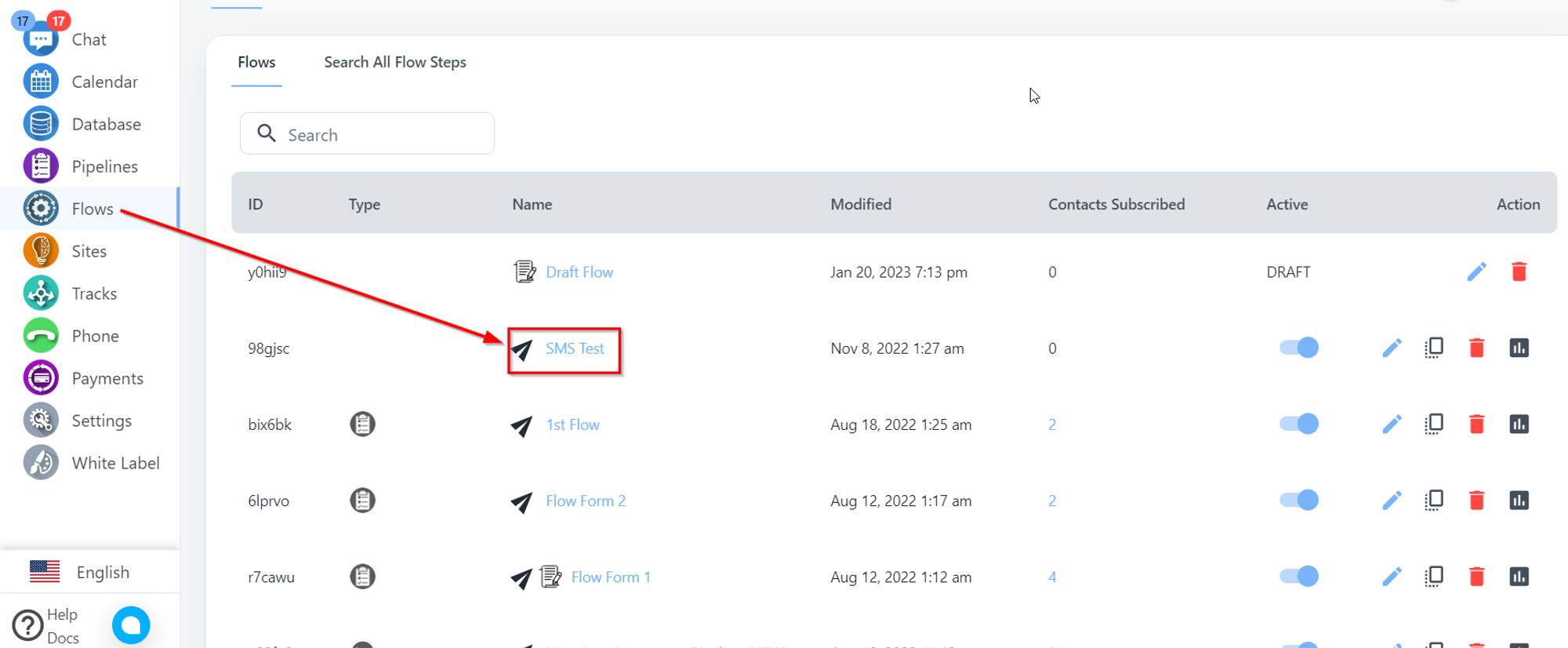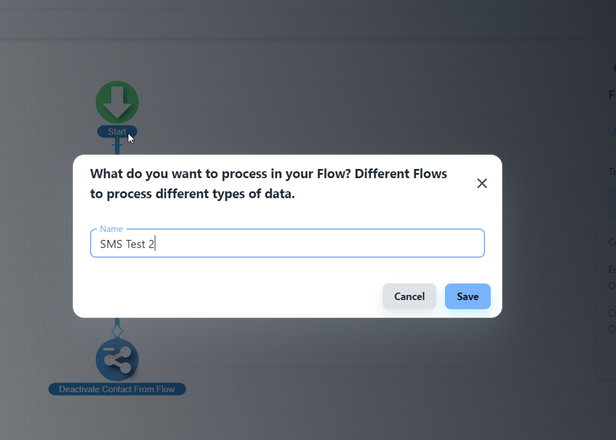 Once Flow is opened, click on bars on right side to see Flow name. In this example, Flow name is SMS Test. Click on pencil icon and change Flow Name.