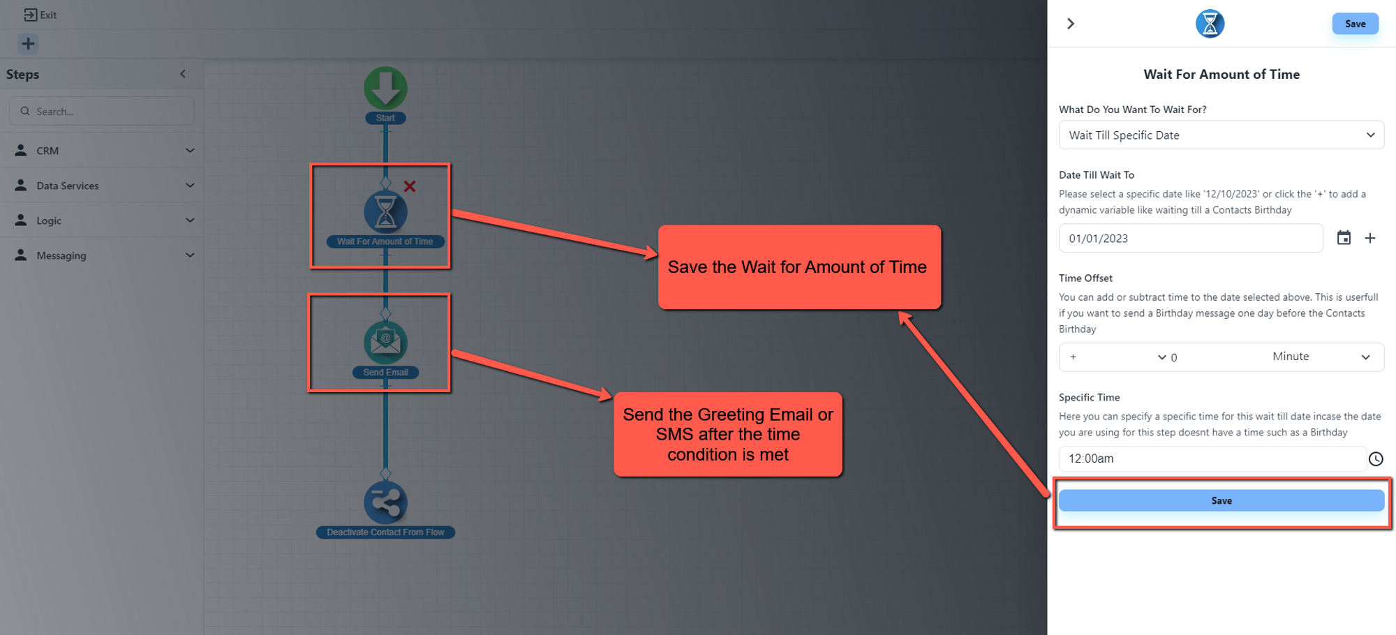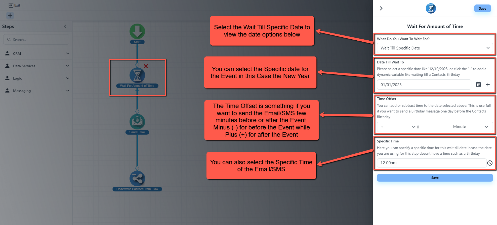 You can find this item in the Logic Section and is basically used for many things such as sending the Customer a New Year Greeting SMS/Email, Scheduled Meeting, Birthday wishes or anything else. It can be used for multiple scenarios but in this case we are using for a greeting message or wishing New Year.