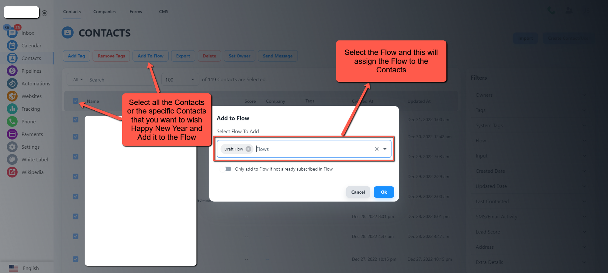 Once the Flow is created you need to assign the Flow to Contacts. At the moment we don’t have a specific Trigger for such events or Wishing Happy New New Year so in this case you need to assign the contacts manually to the Flow.