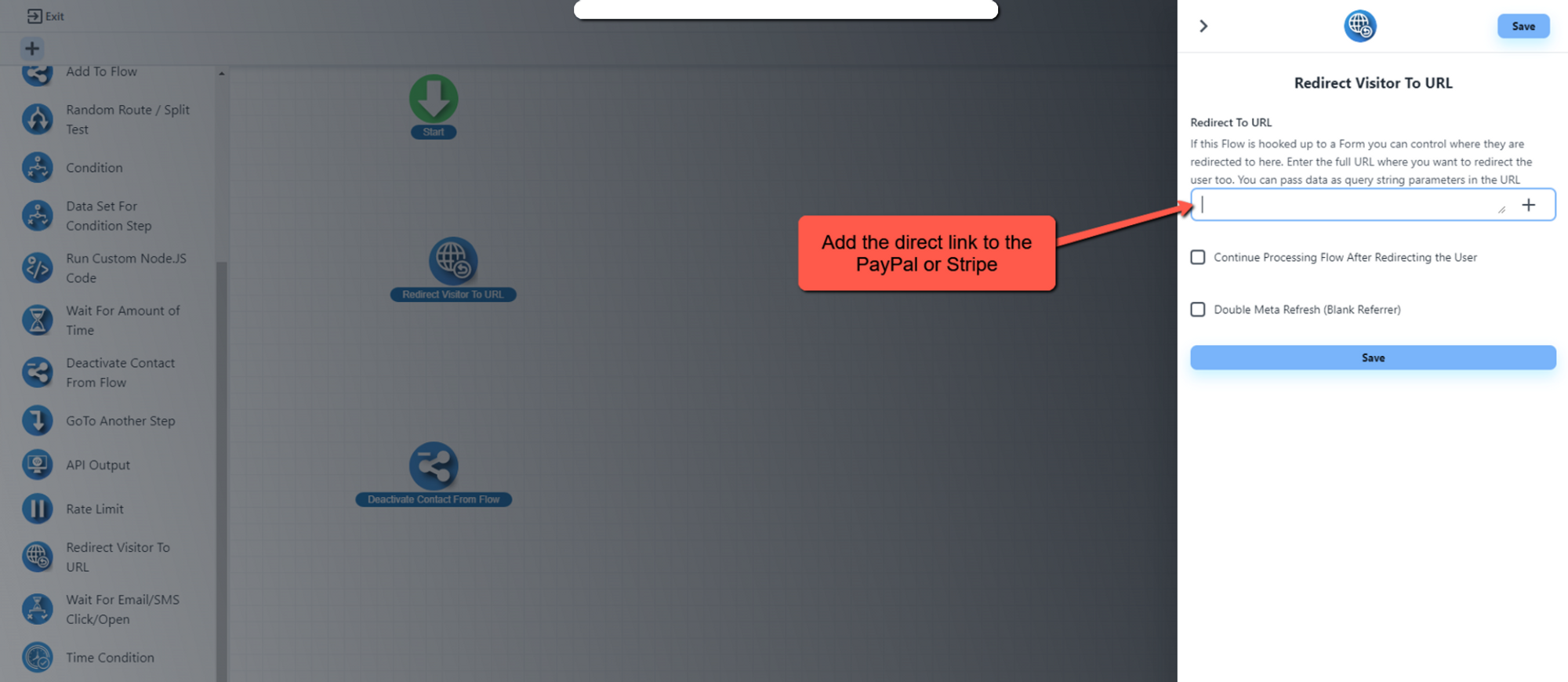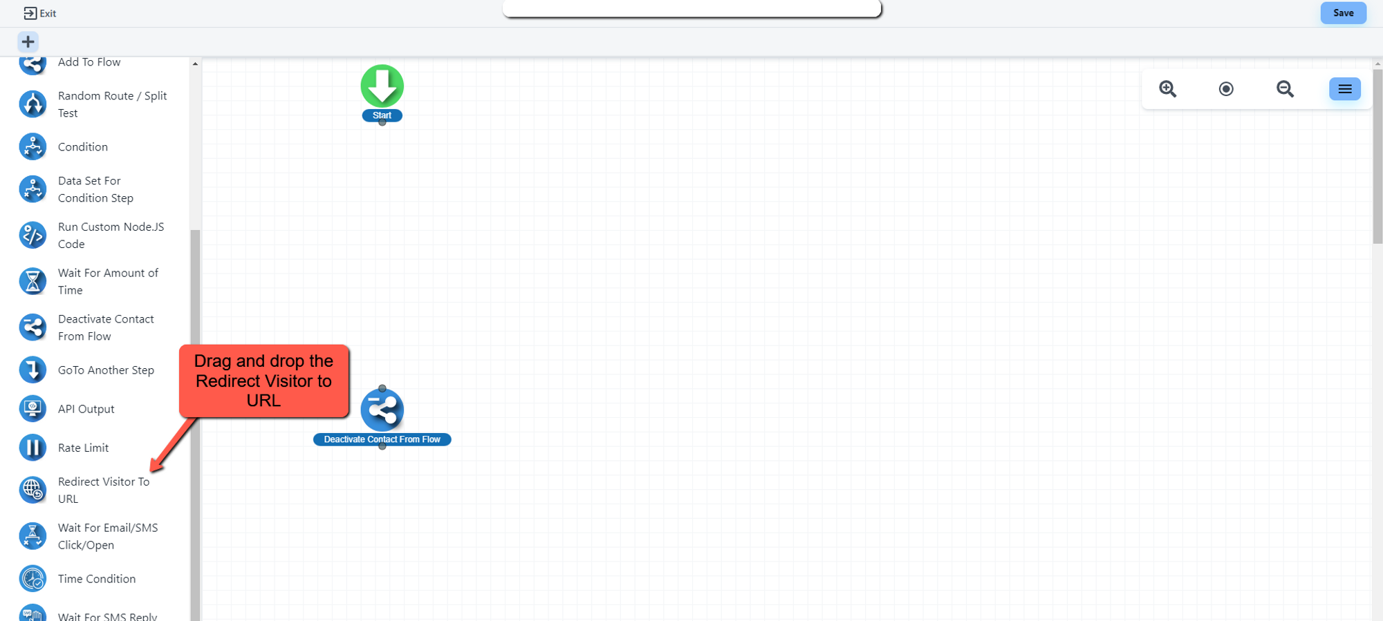 Drag and drop the redirect visitor to URL from the logic section of the automation flow.