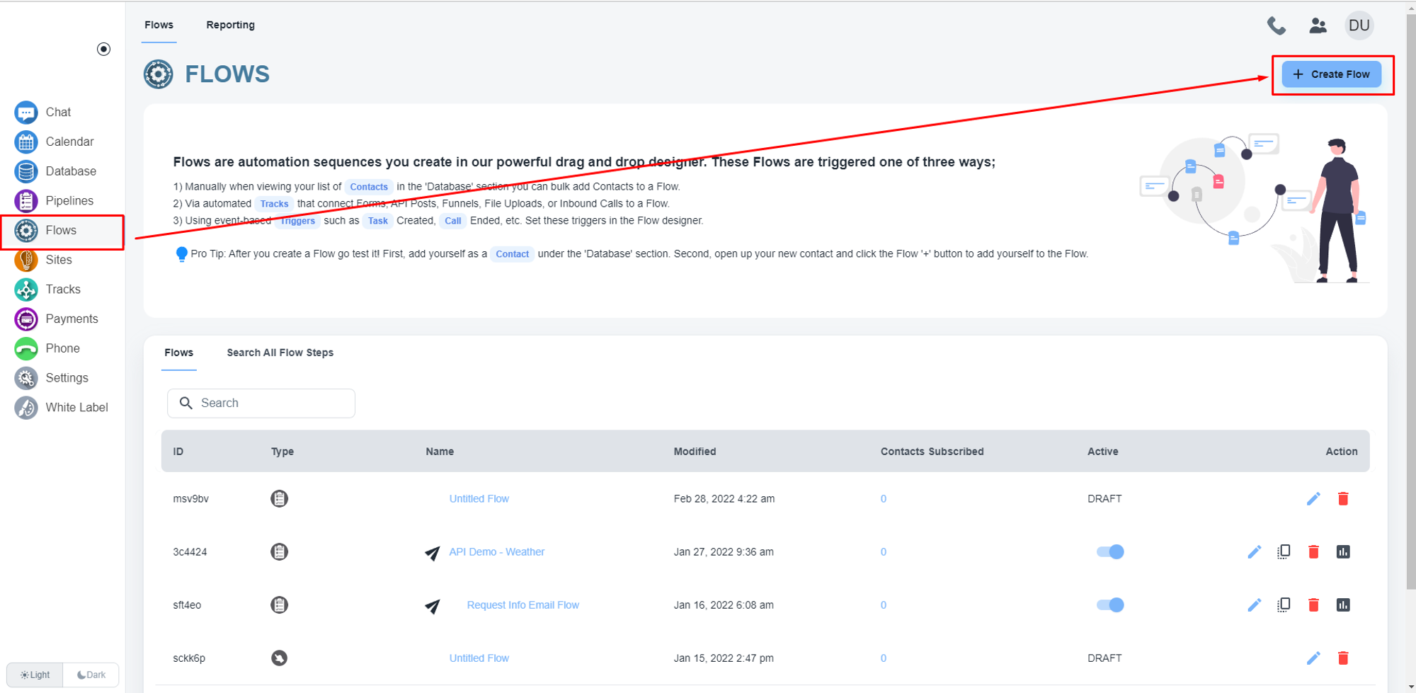 Navigate to the flow builder by clicking the “Flows” on the left side menu. Then when you have the flow page open, you will see a link to “Flows” on the top of your page, please click that. Click on the ‘Create Flow’ button.