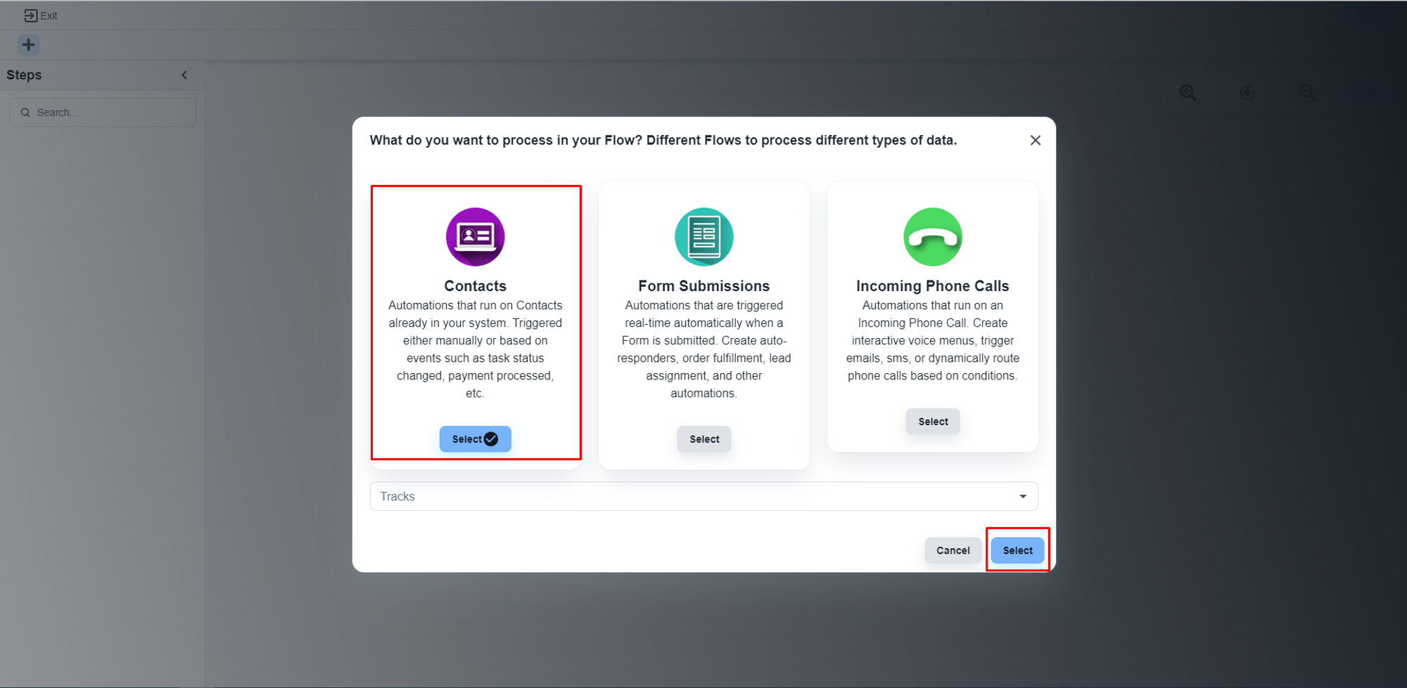 The system will pop up a message box, and you will have to select the first option, 'Contacts'. Now, click on the ‘Select’ button.