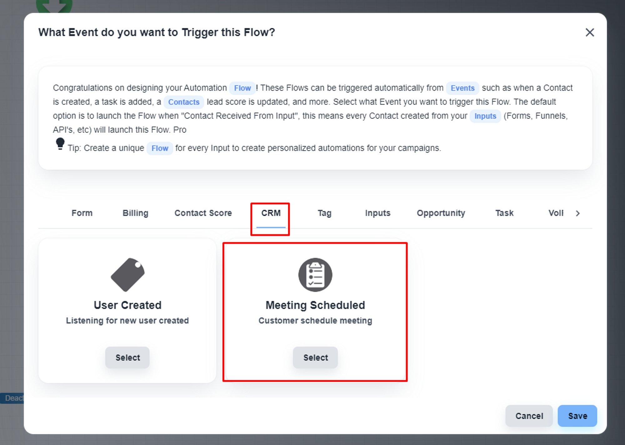 The system will show you all the available triggers inside the System. Under the ‘CRM’ tab, you will get the ‘Meeting Scheduled’ trigger.