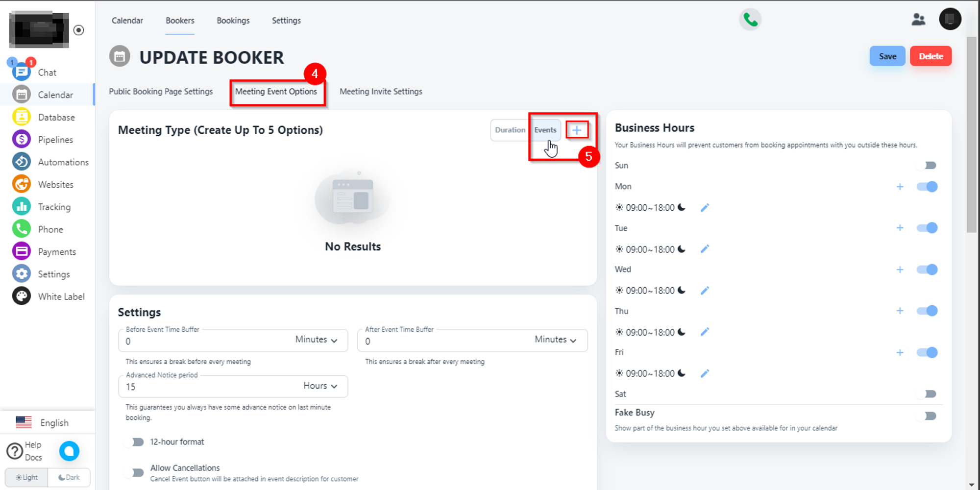2. Click on meeting event option, Enable events option and click on + icon.
