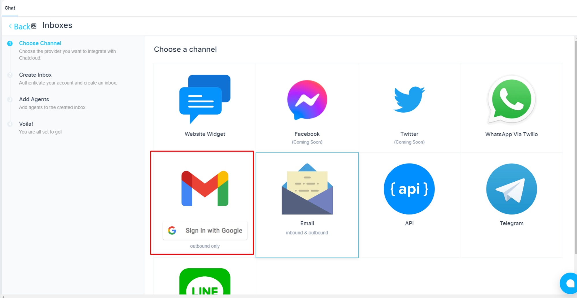 Please, navigate to the ‘Chat’ on the left menu bar. Once the page is opened and clicked on the ‘Inbox’ on the top menu bar. Finally, click on the ‘Add Inbox’ button.