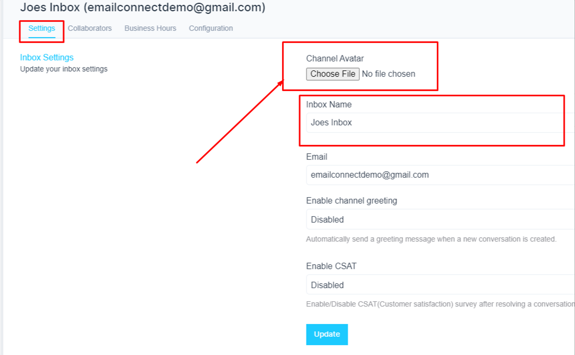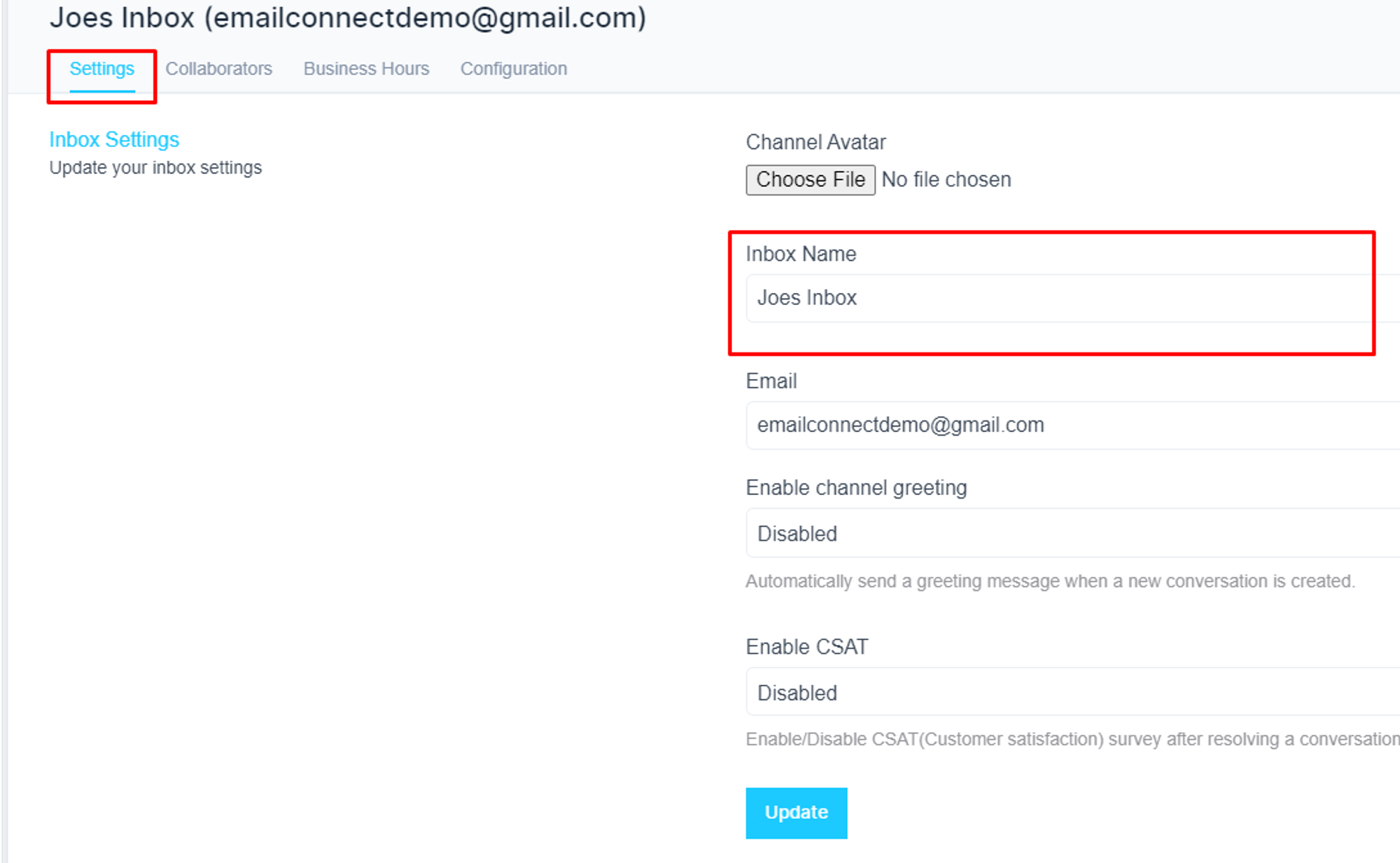 Under the ‘Settings’ tab, you will have the option to change the inbox name