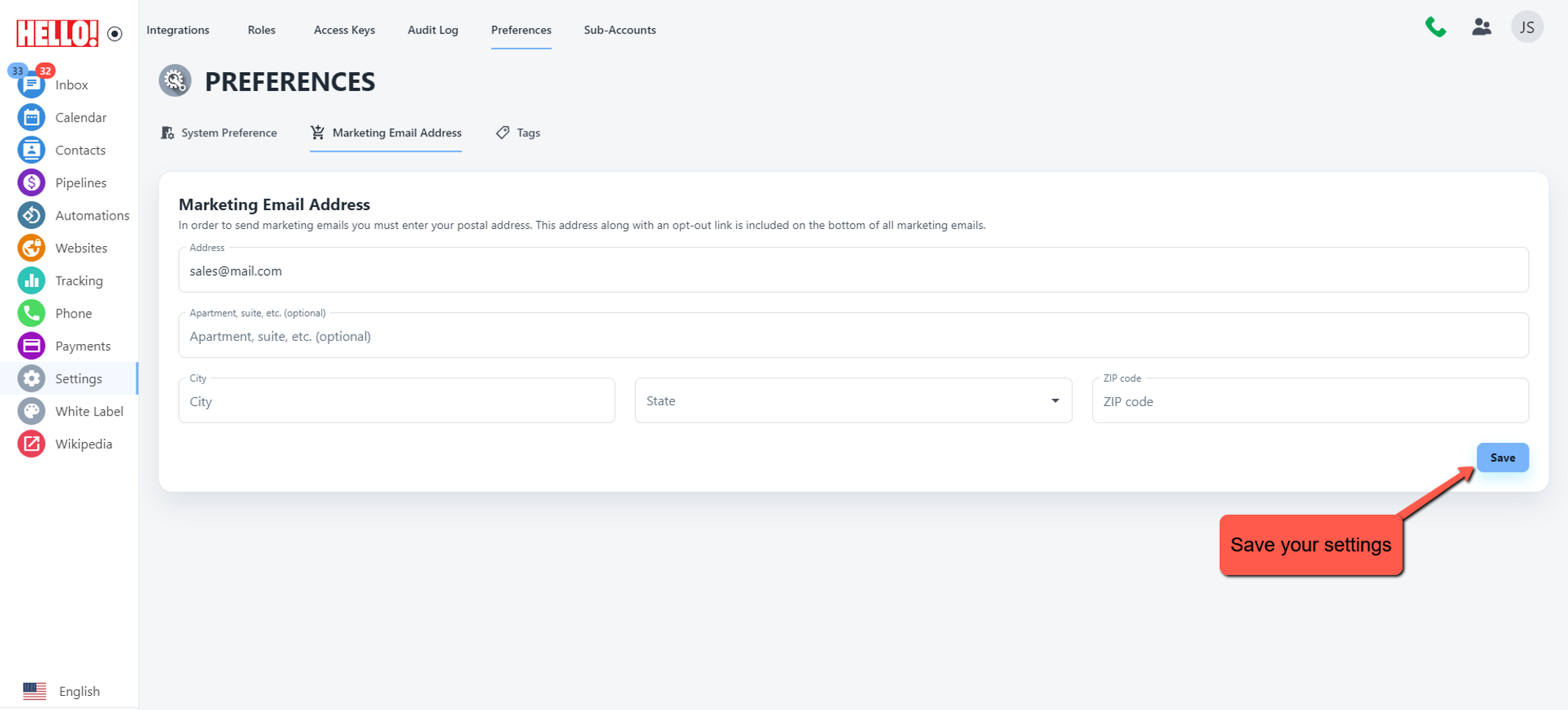 Click settings from the Nav bar and select preferences, inside preferences click Marketing Email Address to add your marketing details.
