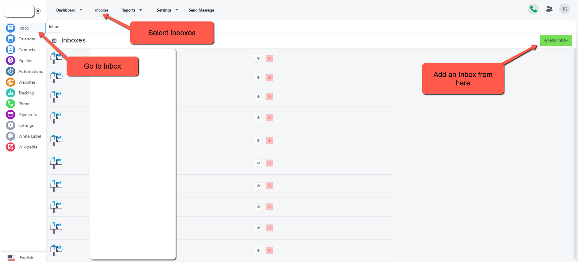 Select the Inbox, inside the inboxes you will find the different inboxes. Create the Inbox by selecting Add Inbox.