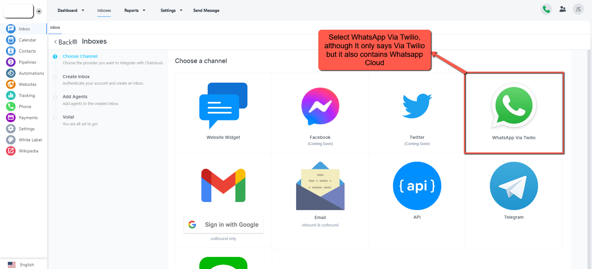 From the different channel select the WhatsApp Via Twilio to create a WhatsApp Cloud.