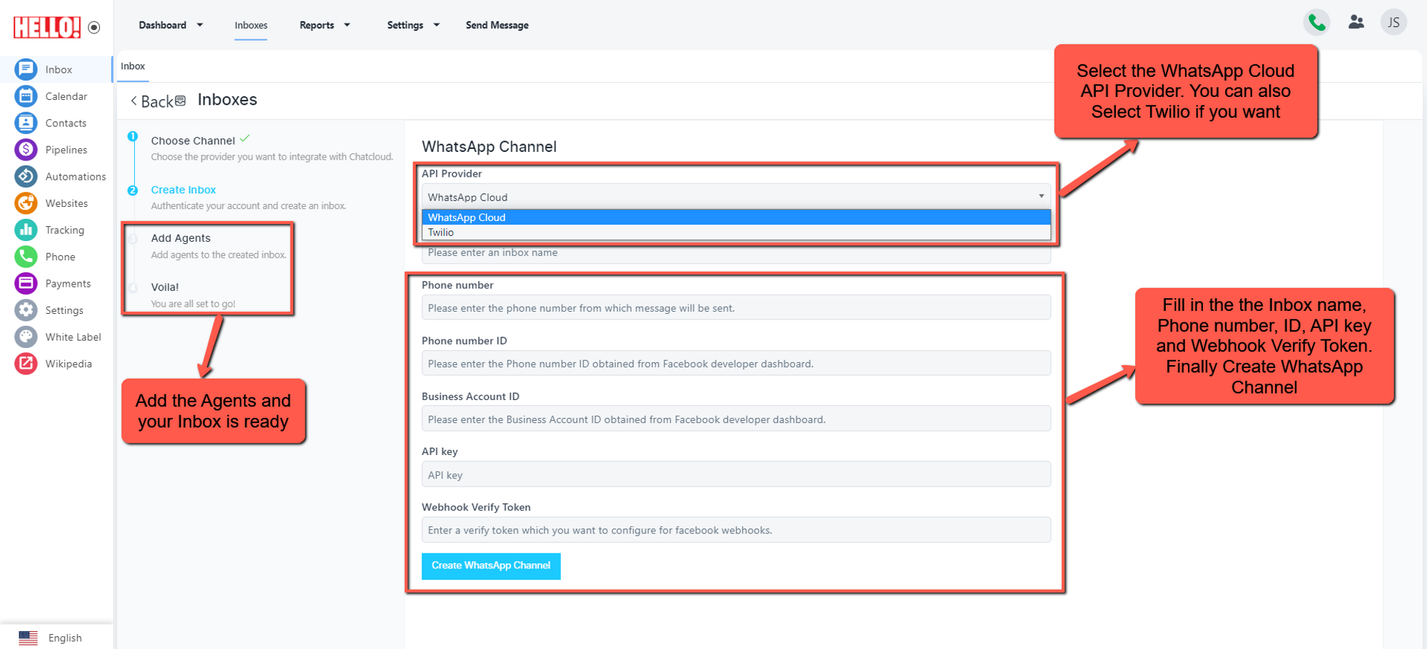 Select the WhatsApp Cloud from the API Provider, fill in the rest of the details. Finally Create WhatsApp Channel and Add Agents.