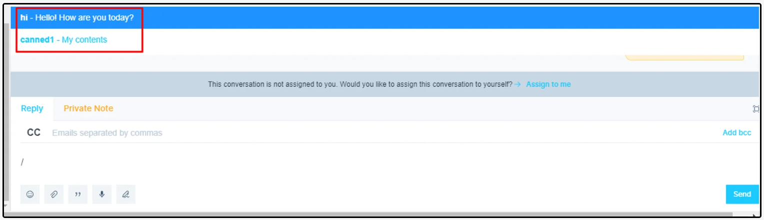 While sending messages, please type ‘/’ to view all the canned messages. You can simple type /canned1 to enter that content.