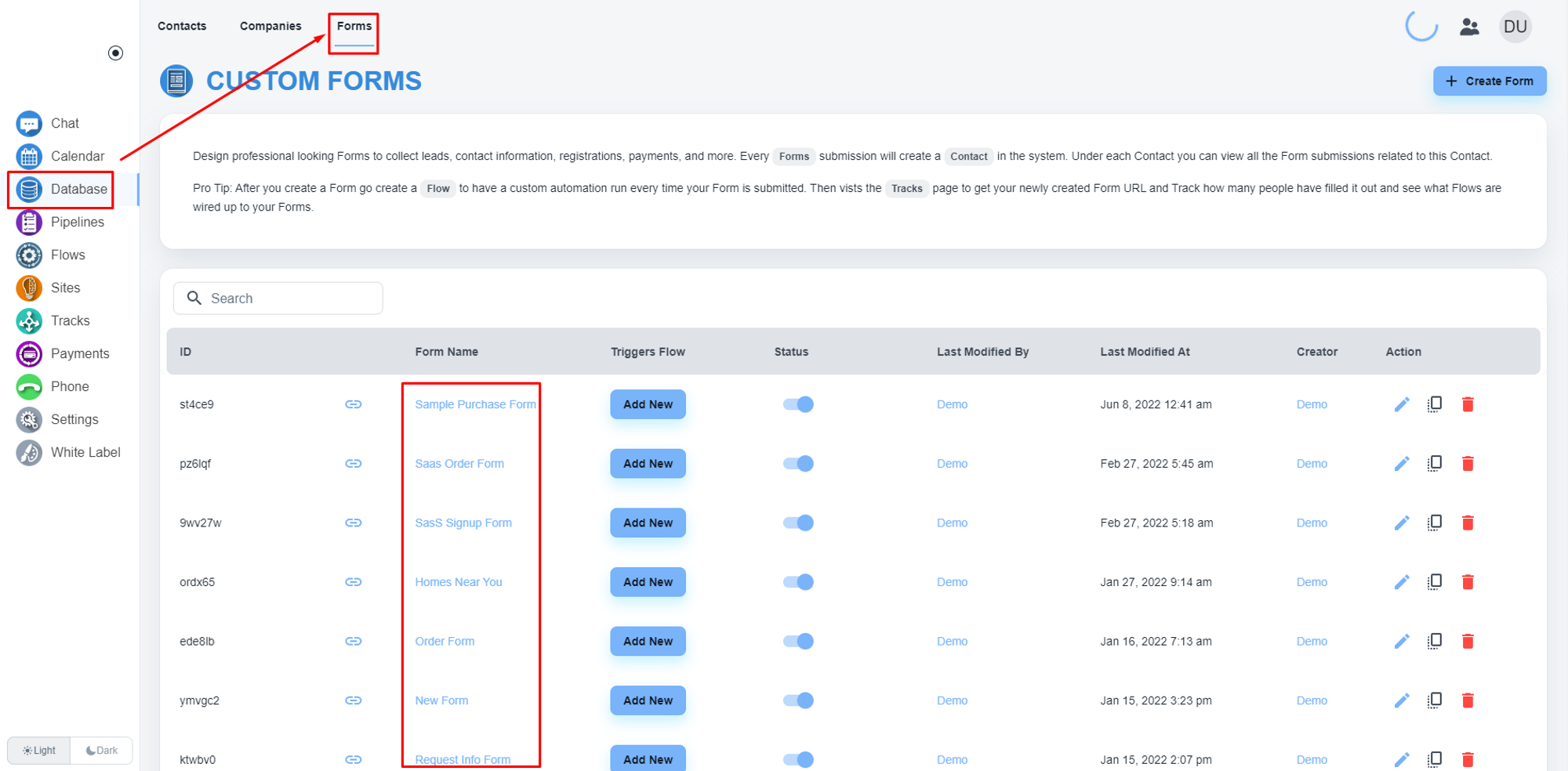 Navigate to the form builder by clicking the “Database” on the left side menu. Then when you have the database page open you will see a link to “Forms” on the top of your page, please click that.