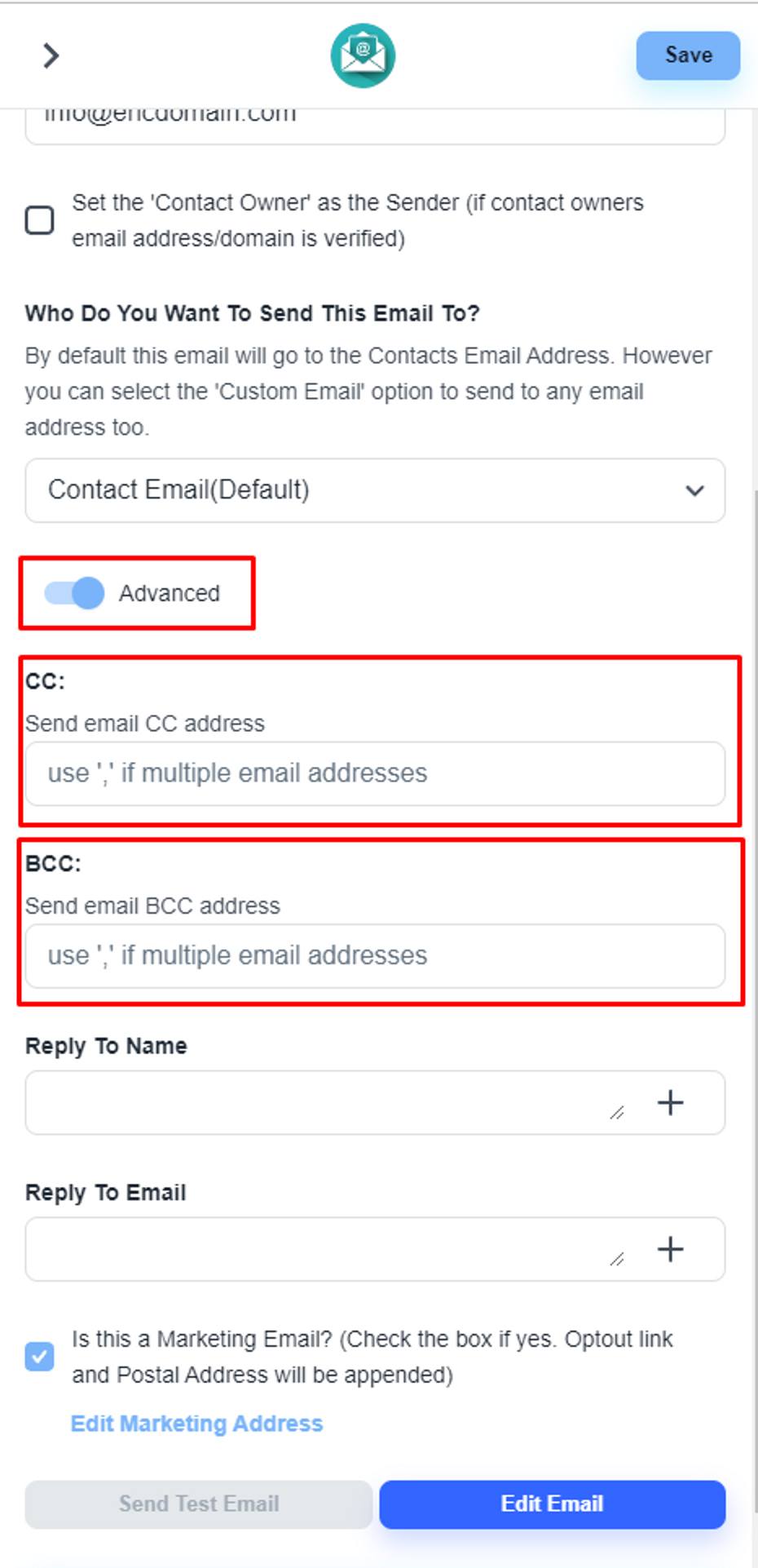 Click on the ‘Advanced’ toggle. The system will allow you to add the ‘CC’ and ‘BCC’ address to get a notification