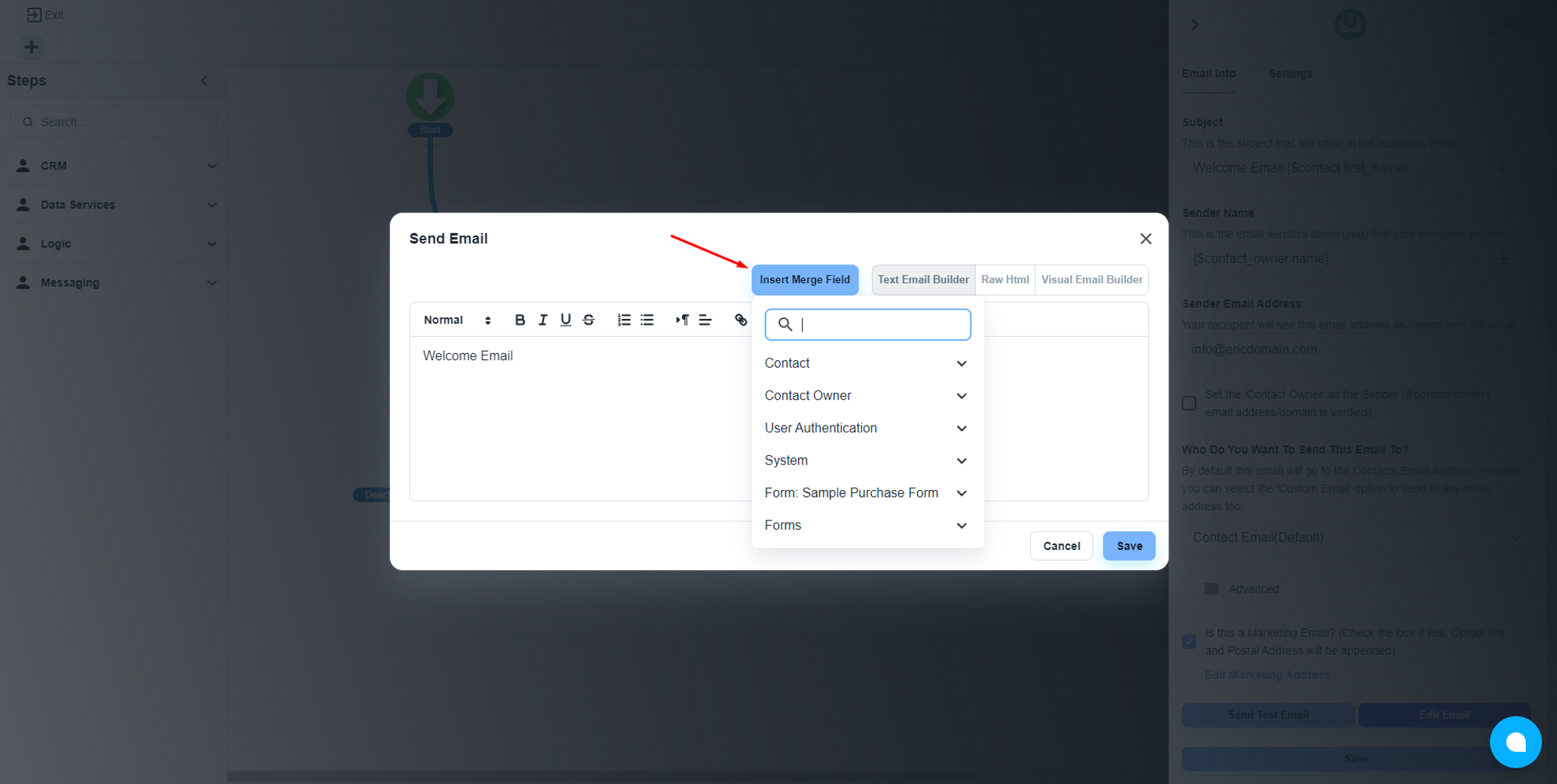The system will load the email building editor. Now, click on the ‘Insert Merge Field’ to add the dynamic fields.