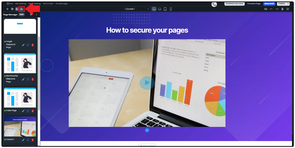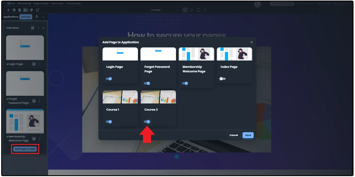 On the bottom of your app on the left sidebar, click on Add Pages to Application. Select the pages you want to be secured, then hit save.