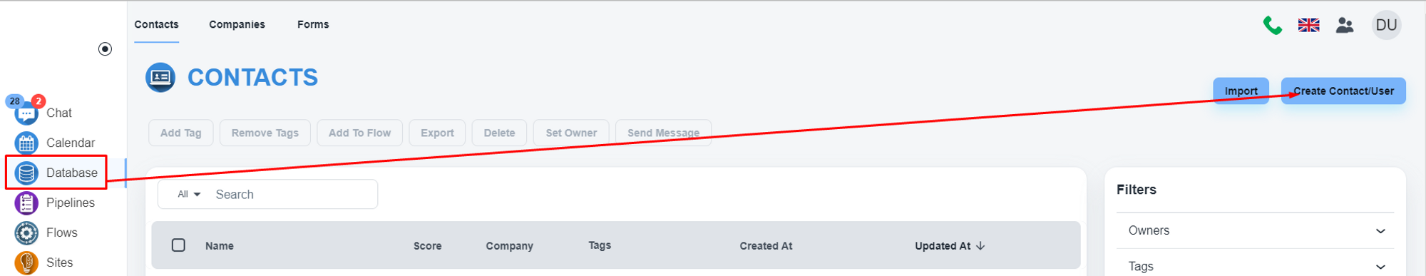 Please, create a contact for the user if you don’t have that already. Please, click on the ‘Database’ menu on the left menu bar. Once the page is loaded, click on the ‘Create Contact/User’ button.