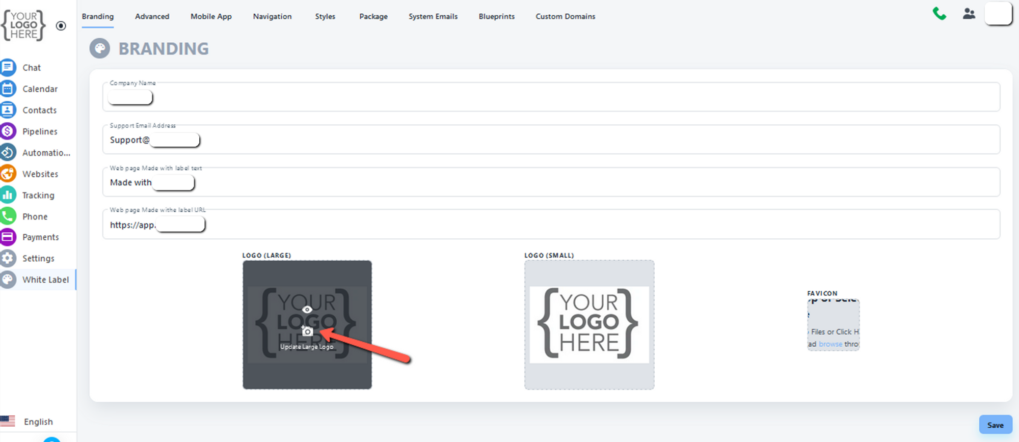 1. Click the White label tab from the side Nav Bar. Select the Branding tab at the top of the screen, you have the different white label settings such as the Company Name, Email and the different logo sizes.