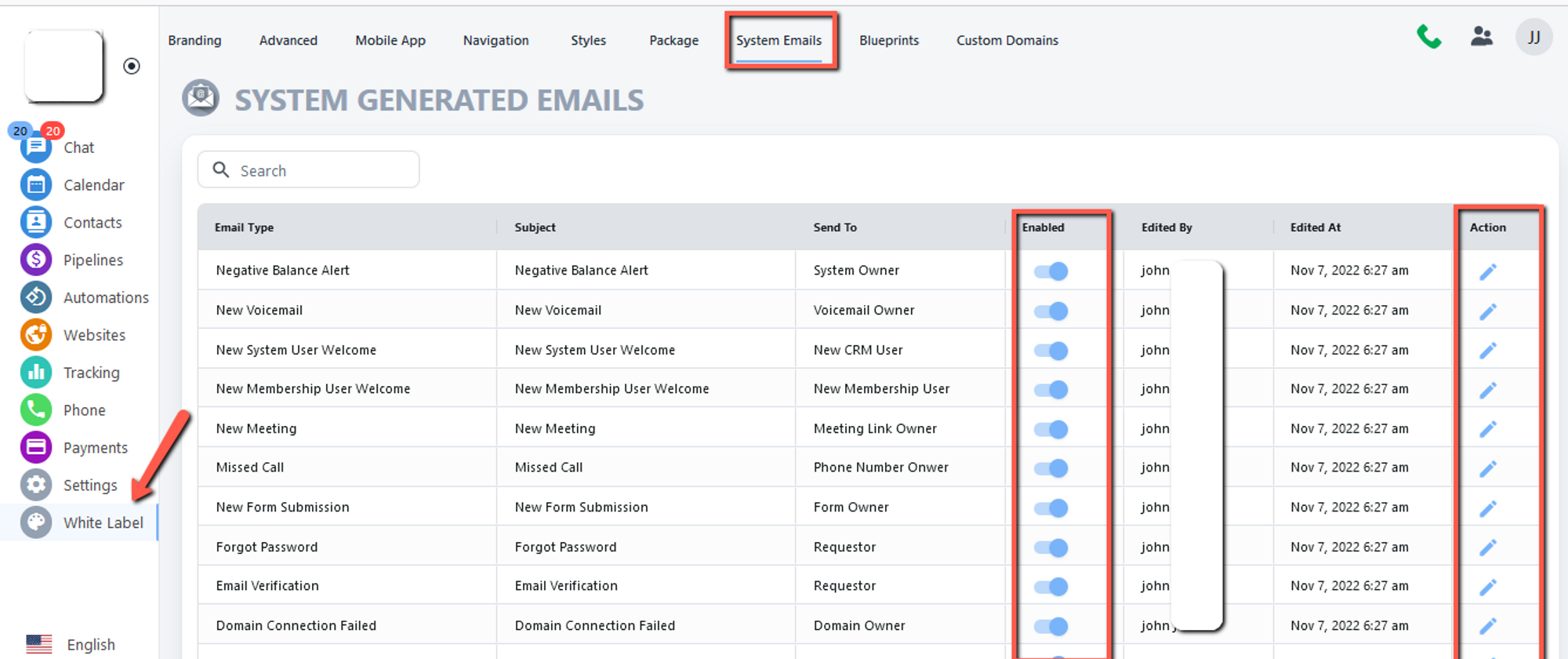 1. First, you have to click on the white label tab from the left side, Click on the System Emails from your top address bar, If you want to Enable or Disable Email turn ON/OFF the notification.