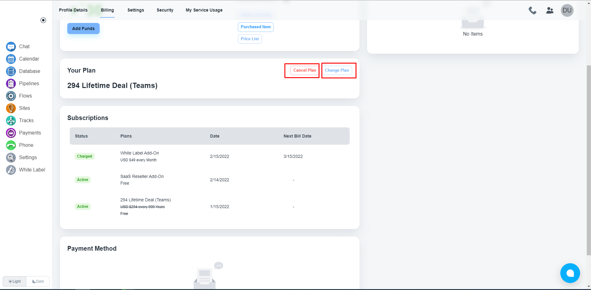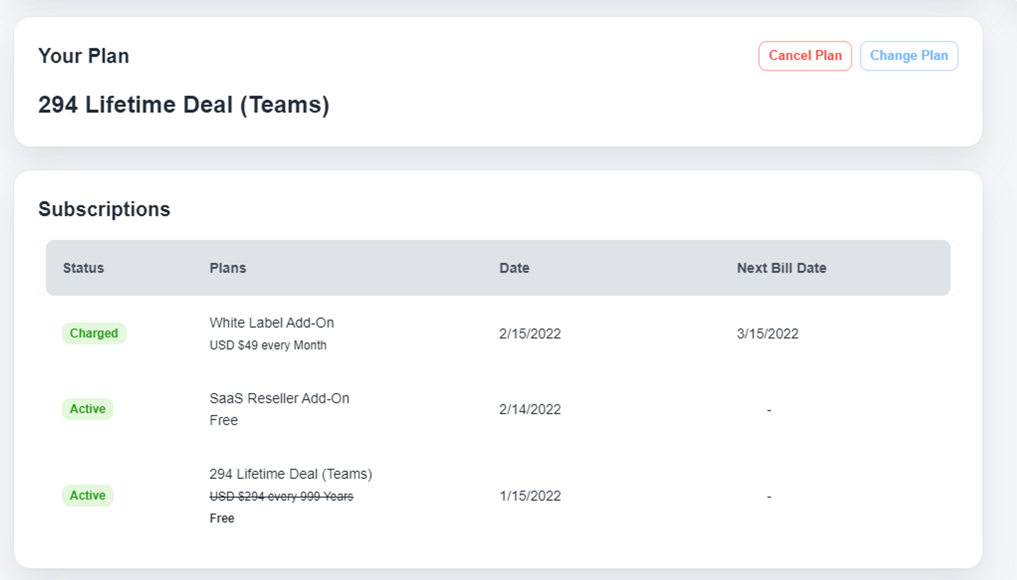 After logging into your ‘Billing’ section, you will get these two buttons to cancel or upgrade your subscription plans under the' Your Plan' area.