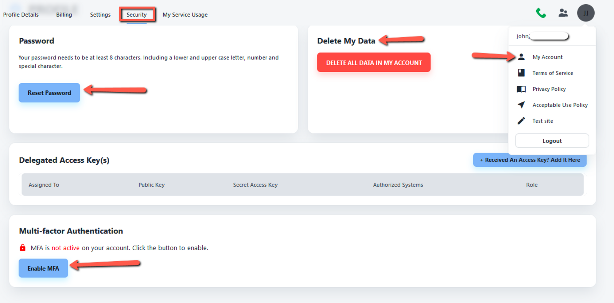 1. First, you need to click on My account, click on security then click on the received access key.