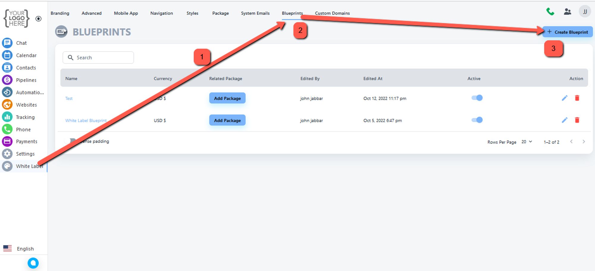 1. Click on the white label tab from the left side, Click on the blueprint from your top address bar and then click on create the blueprint.