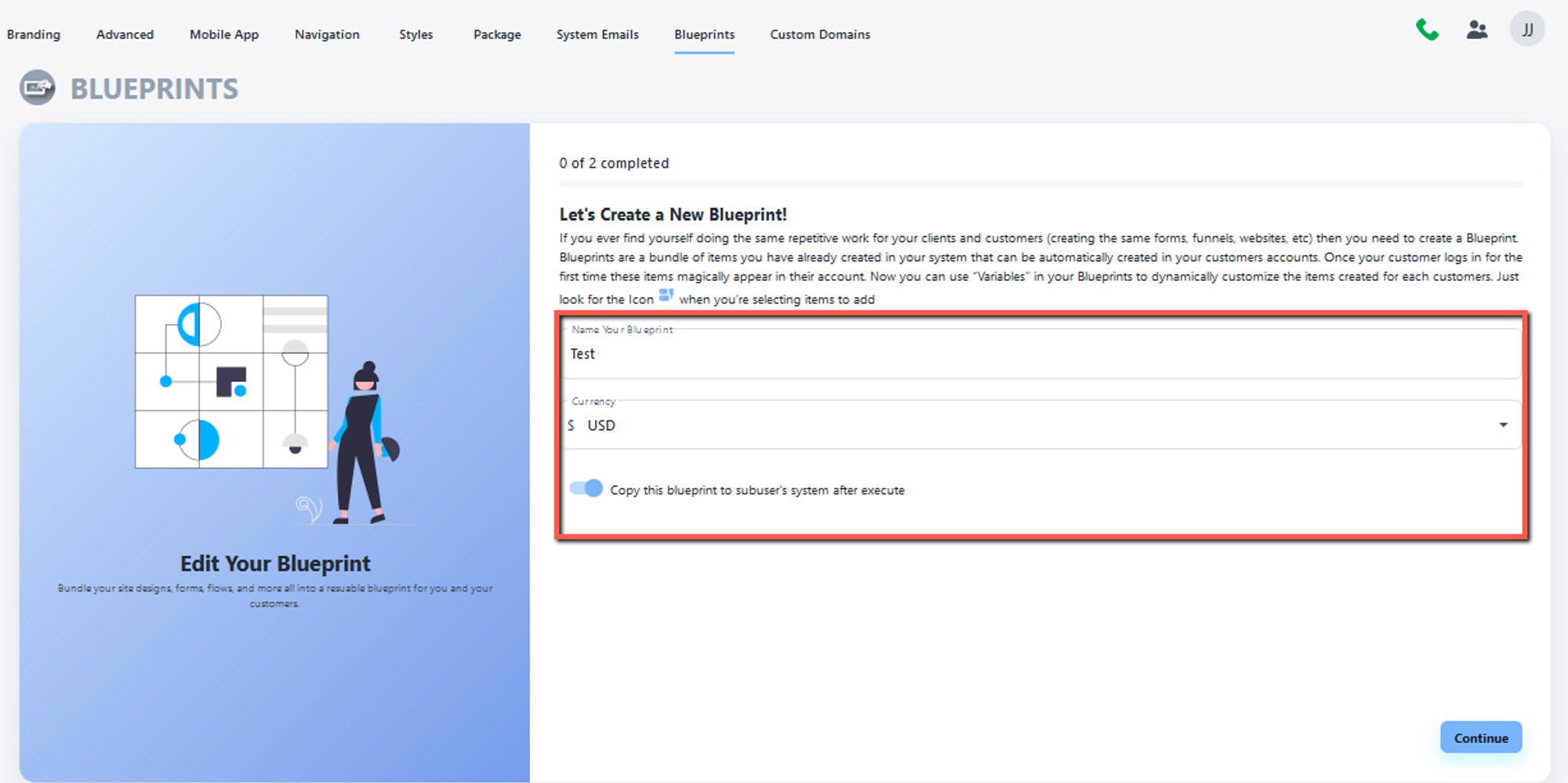 2. Write the name of the blueprint and set the currency status and checked ‘copy this blueprint to the sub-users system. And next step is to Click on the continue button.