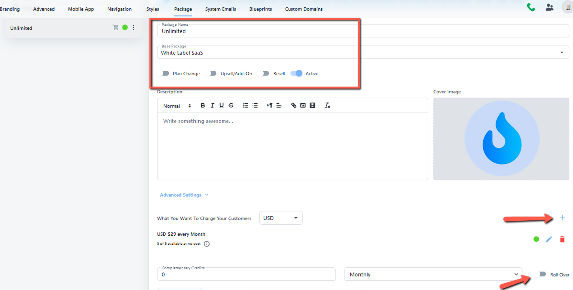 5. If you want create with the package then click on “Add this blueprint yo a Package now” select the package name, also select the base package, and check active. If you add pricing then click the + button and add pricing and check Roll over for permission.