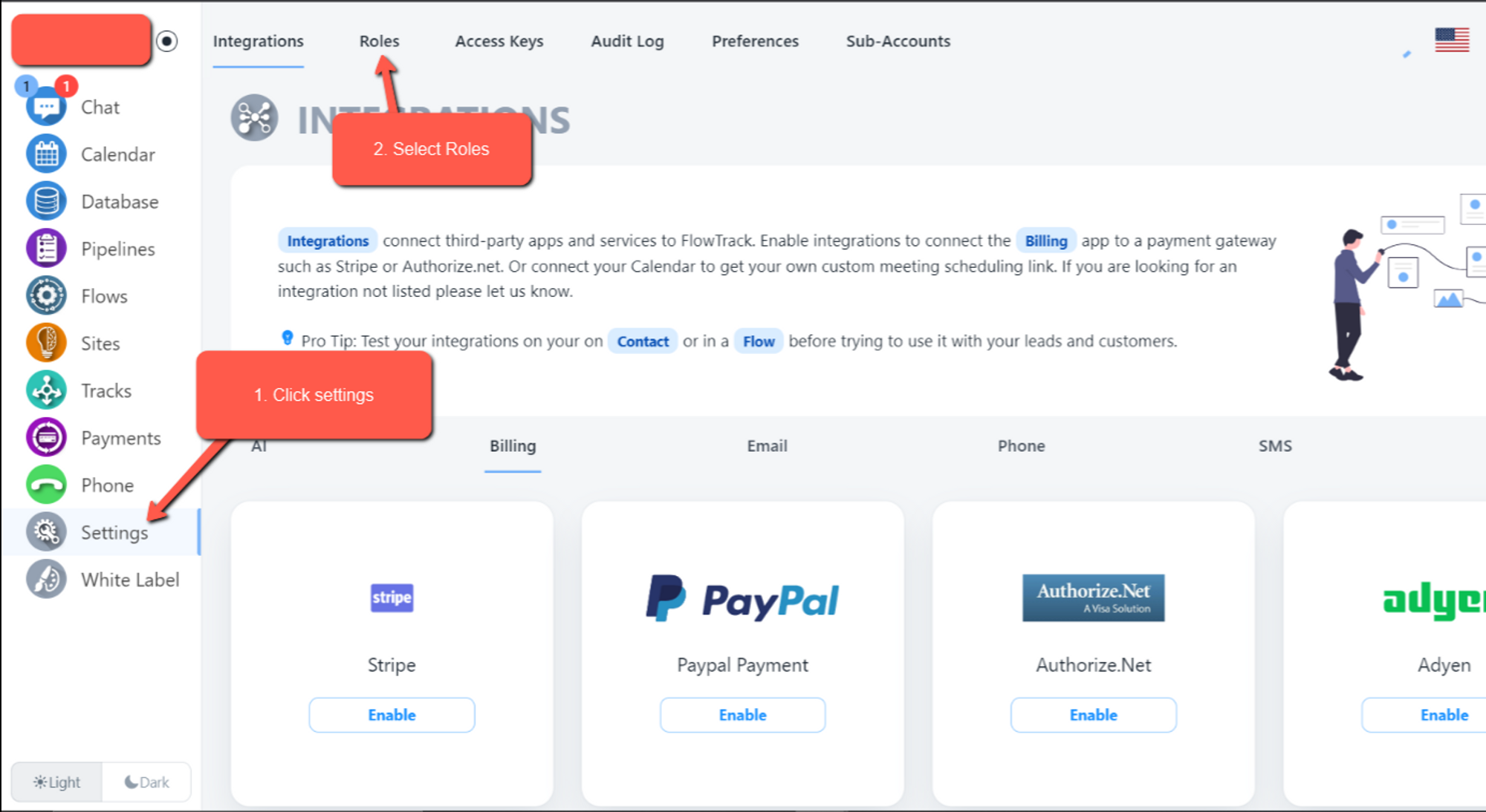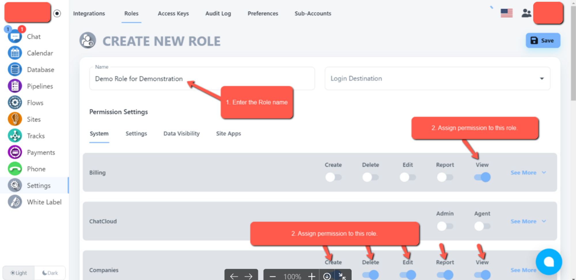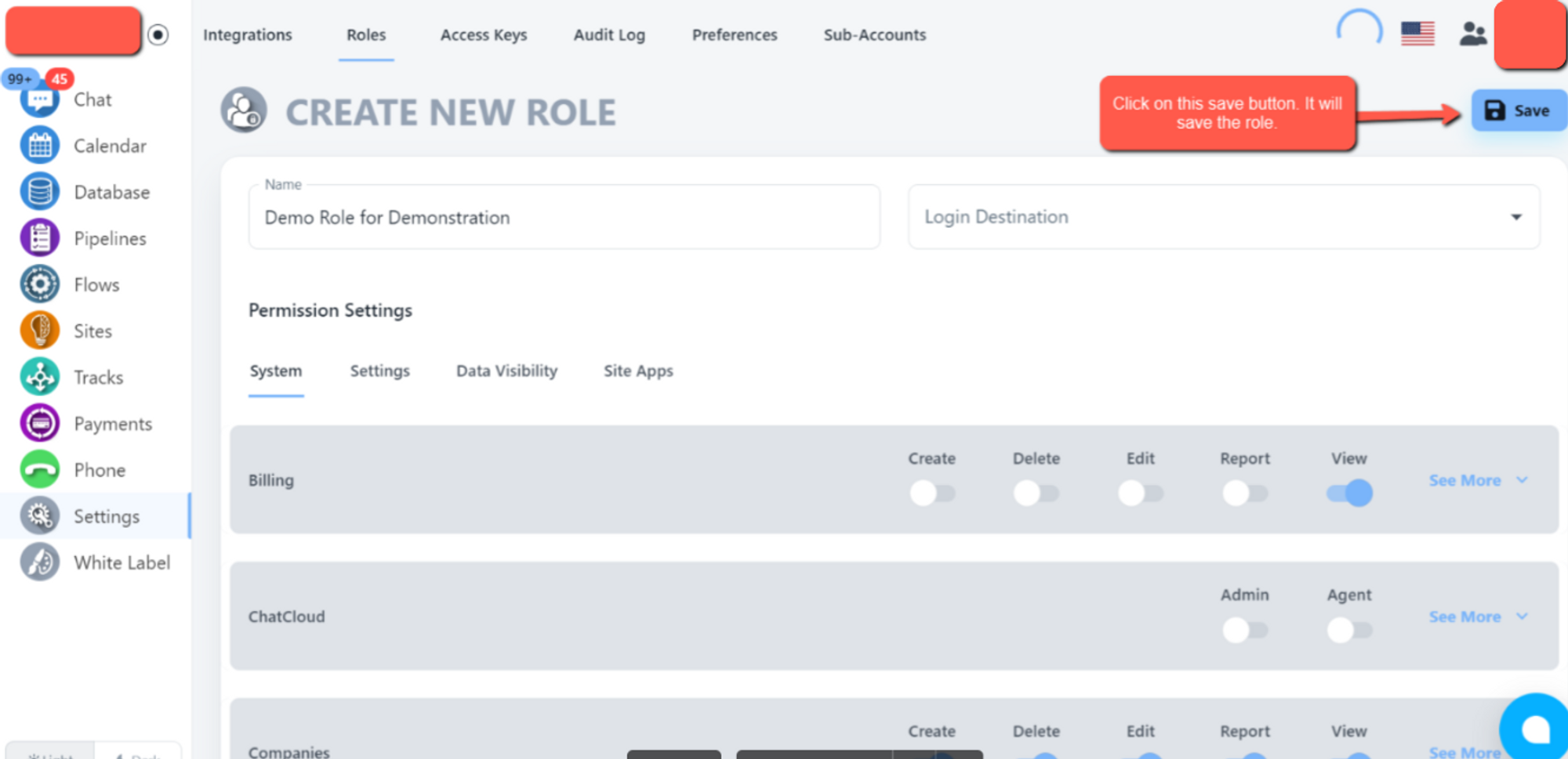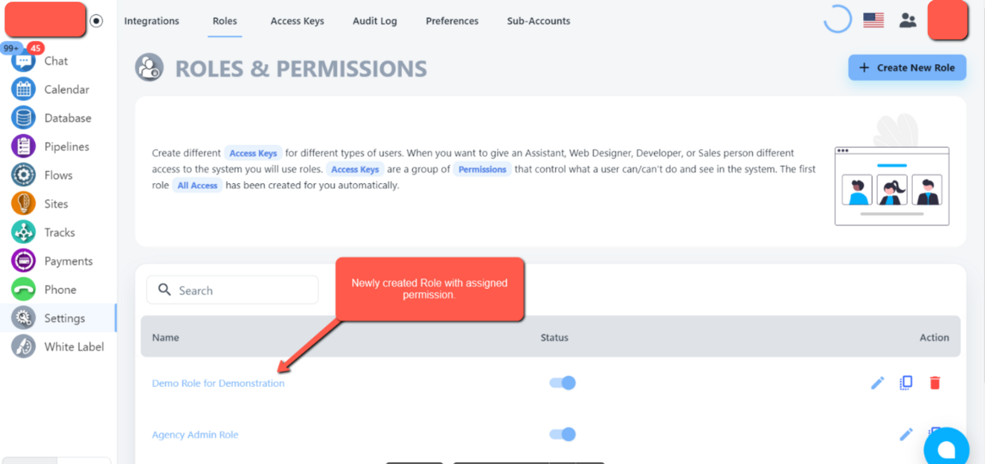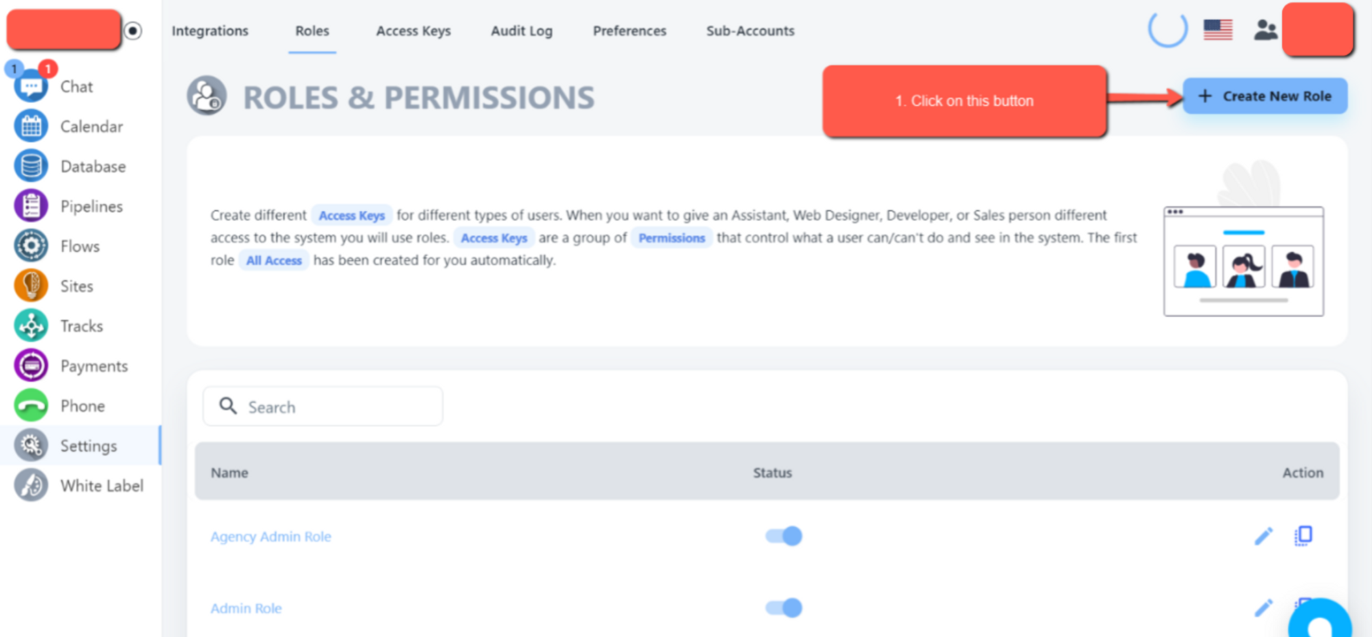Create different Access Keys for different types of users. When you want to give an Assistant, Web Designer, Developer, or Sales person different access to the system you will use roles. Access Keys are a group of Permissions that control what a user can/can't do and see in the system. The first role All Access has been created for you automatically.