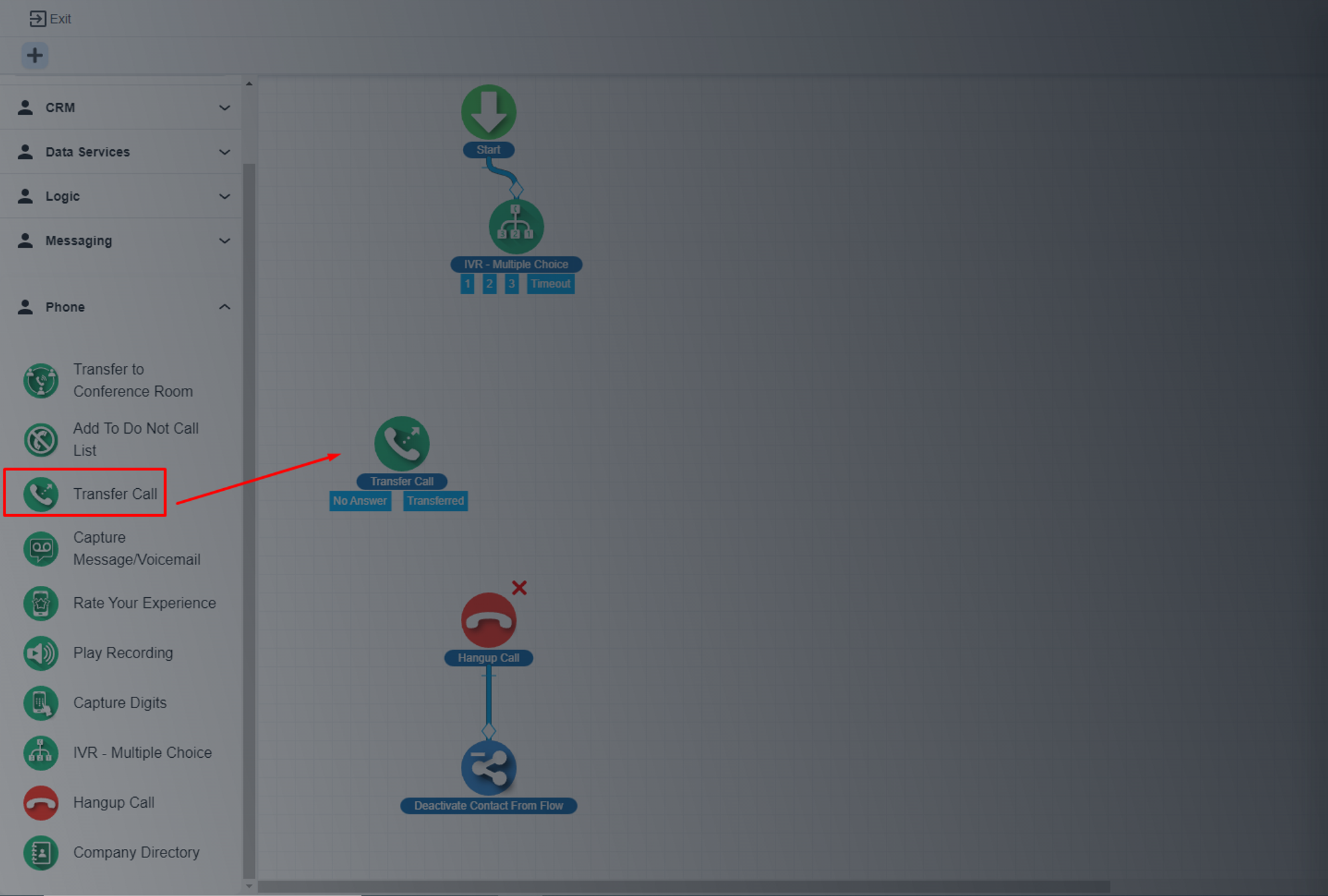 Please, drag the ‘Transfer Call’ step to the flow builder and add it under the IVR step