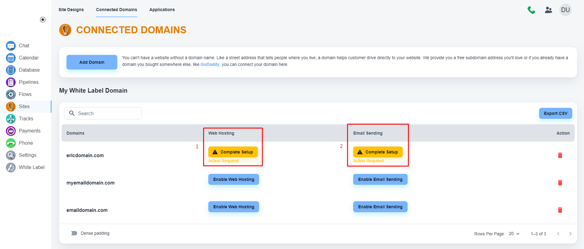 Navigate to the domain panel by clicking the “Sites” on the left side menu. Then when you have that page open you will see a link to “Connected Domains” on the top of your page, please click that.
