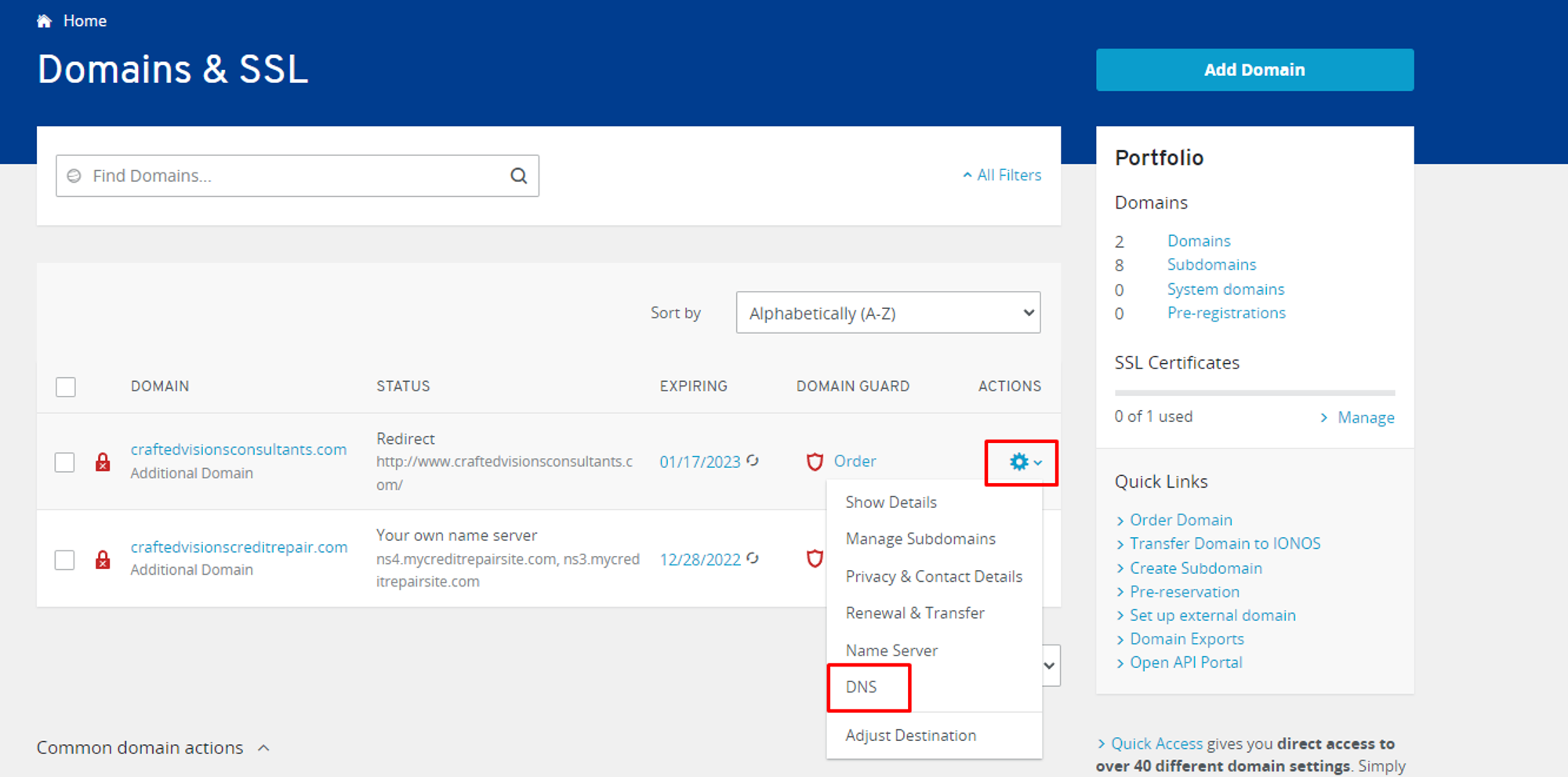 After logging in, please, click on the concerned domain's settings gear icon, and you will get the 'DNS' option there.