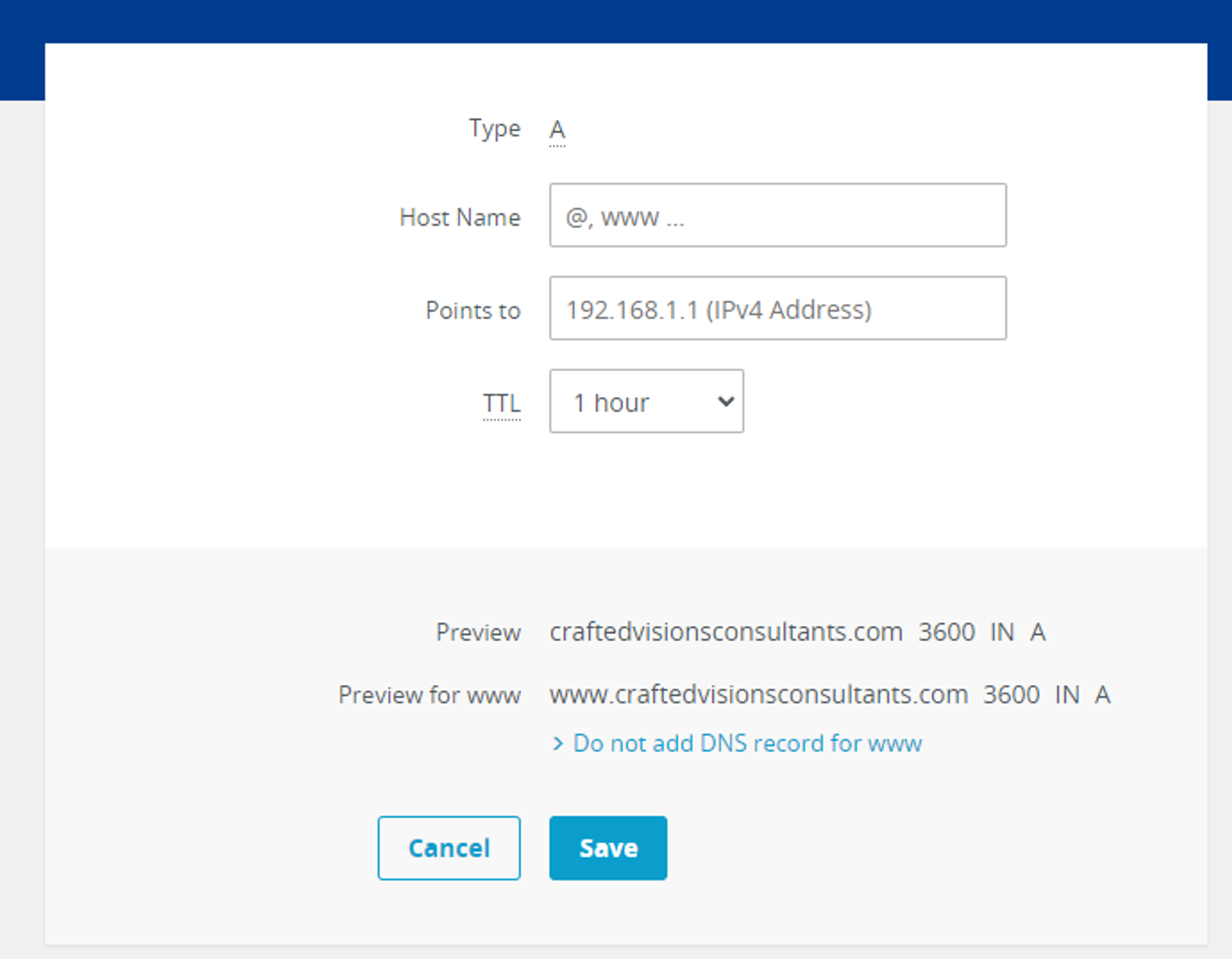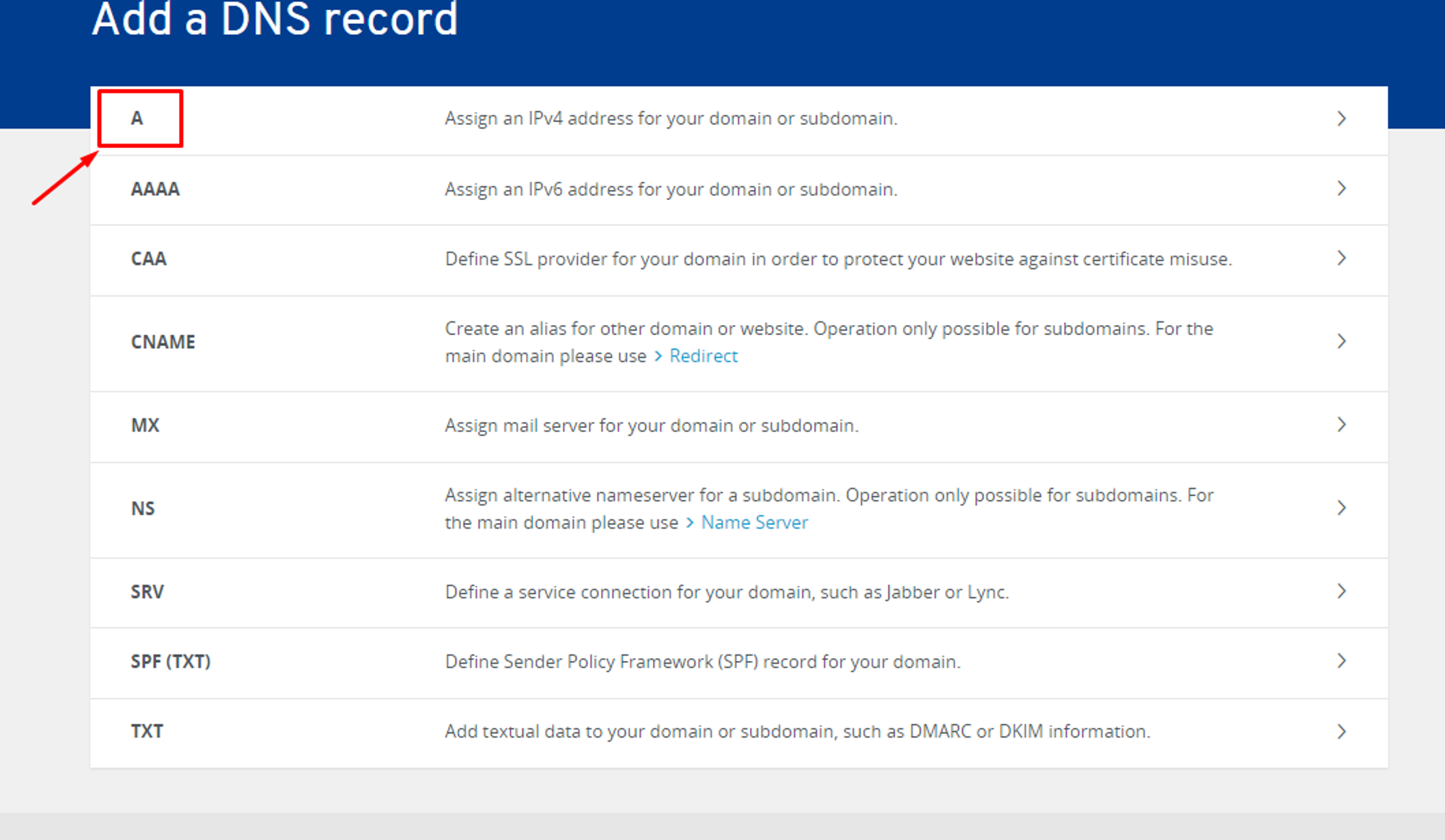 Now, the System will provide you with the option to select the DNS record type. Please, click on the 'A' to add the record for web hosting.