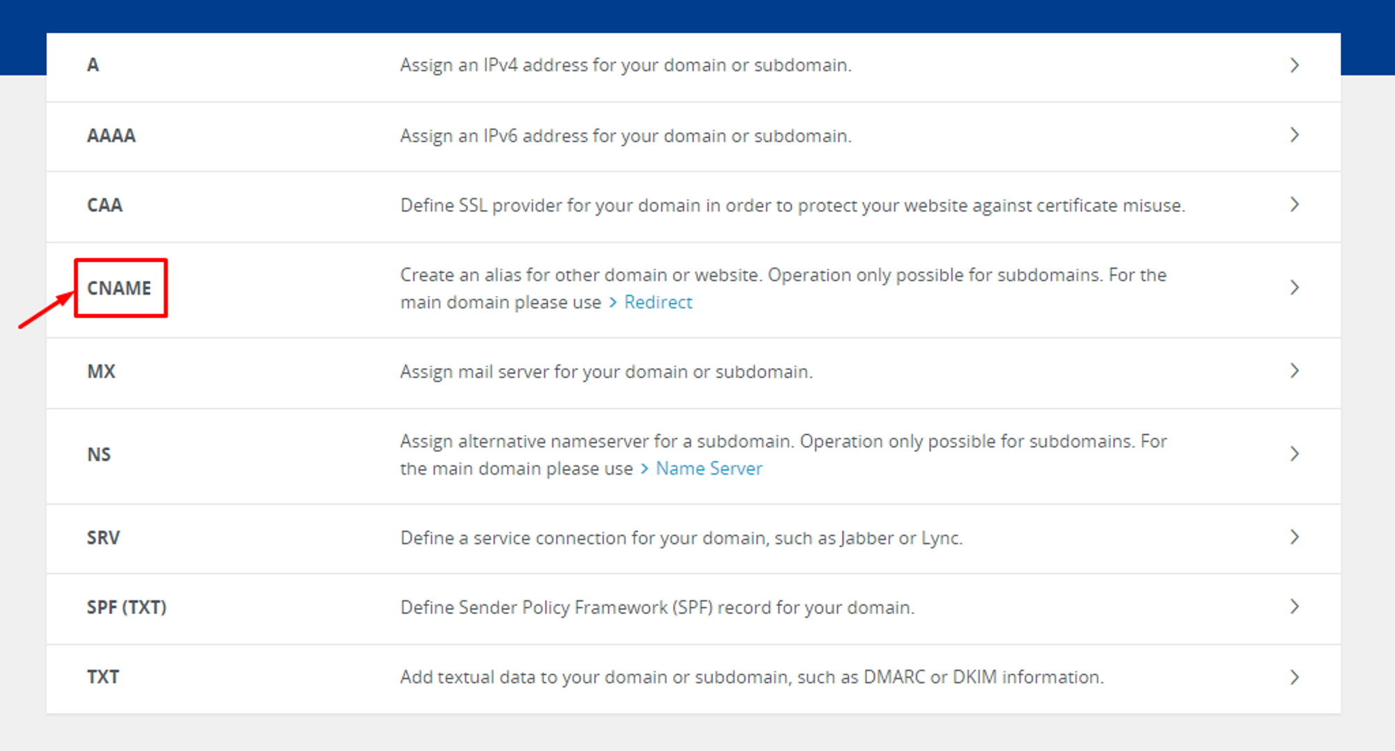 To select the proper type of DNS record, you can define that from System-provided DNS records. Please, check the screenshot