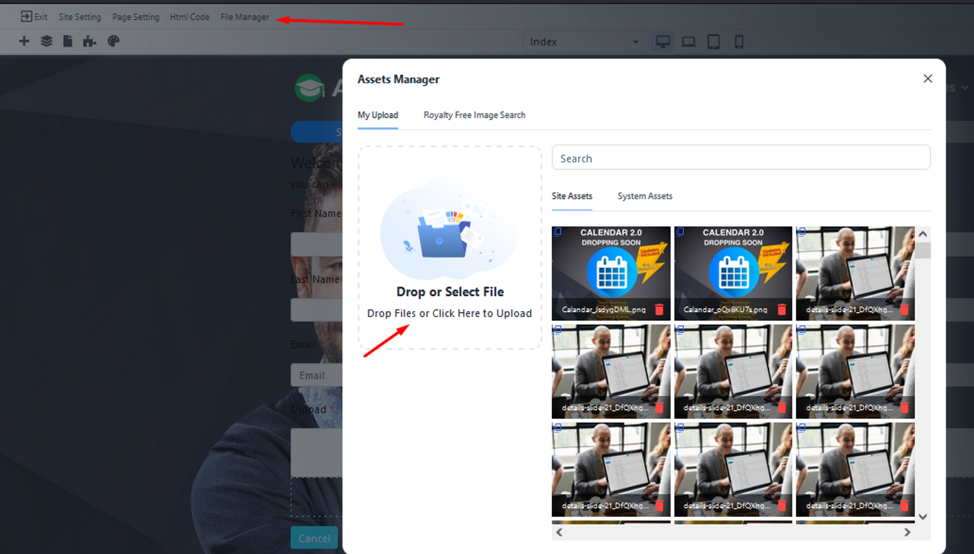 2. Click on File manager, then click on Drop or select the file.