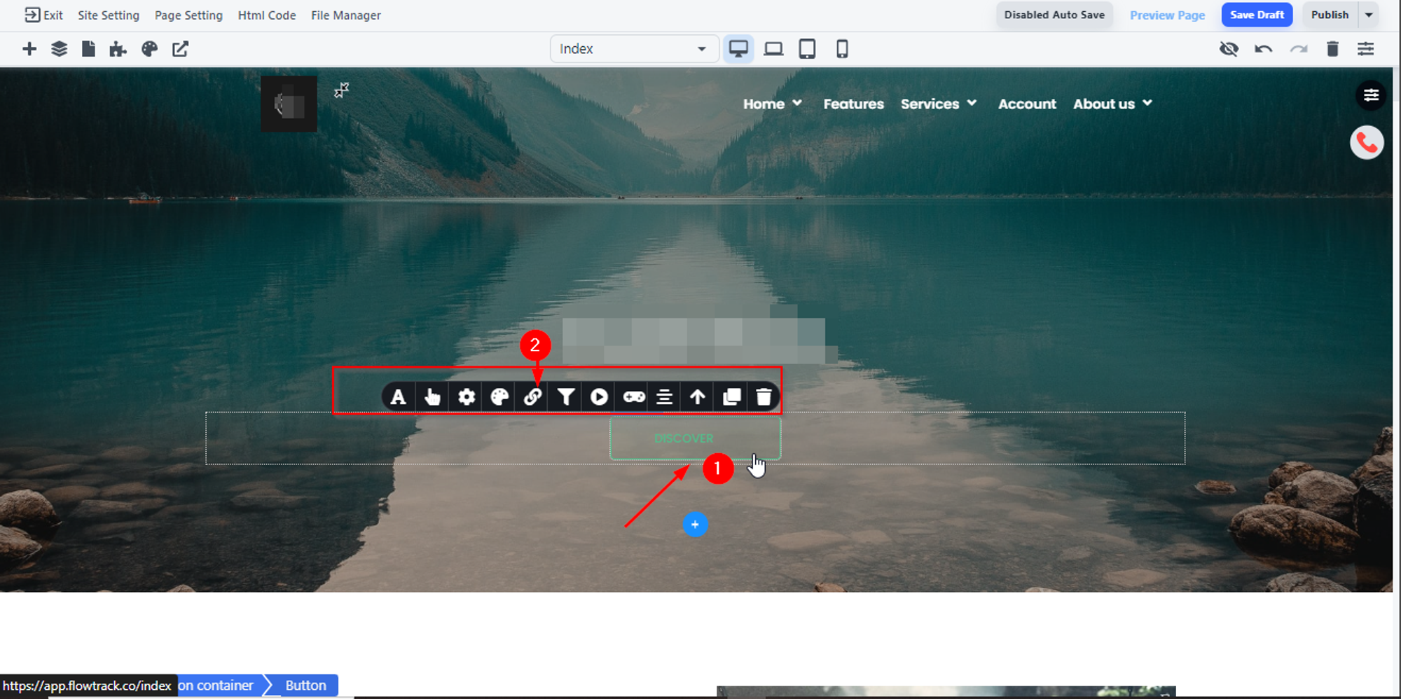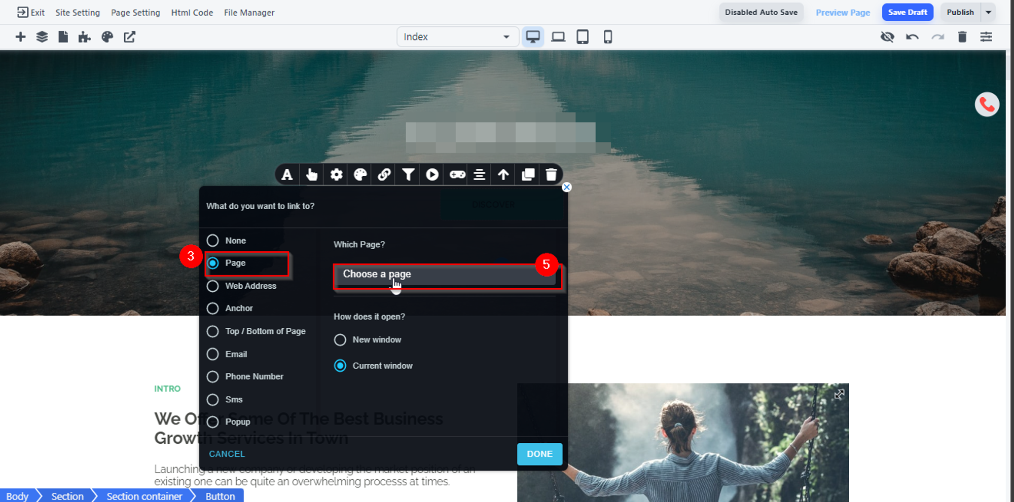 3. If you want to link the button with page click the page bullet and select the desire page you want to link as shown below: