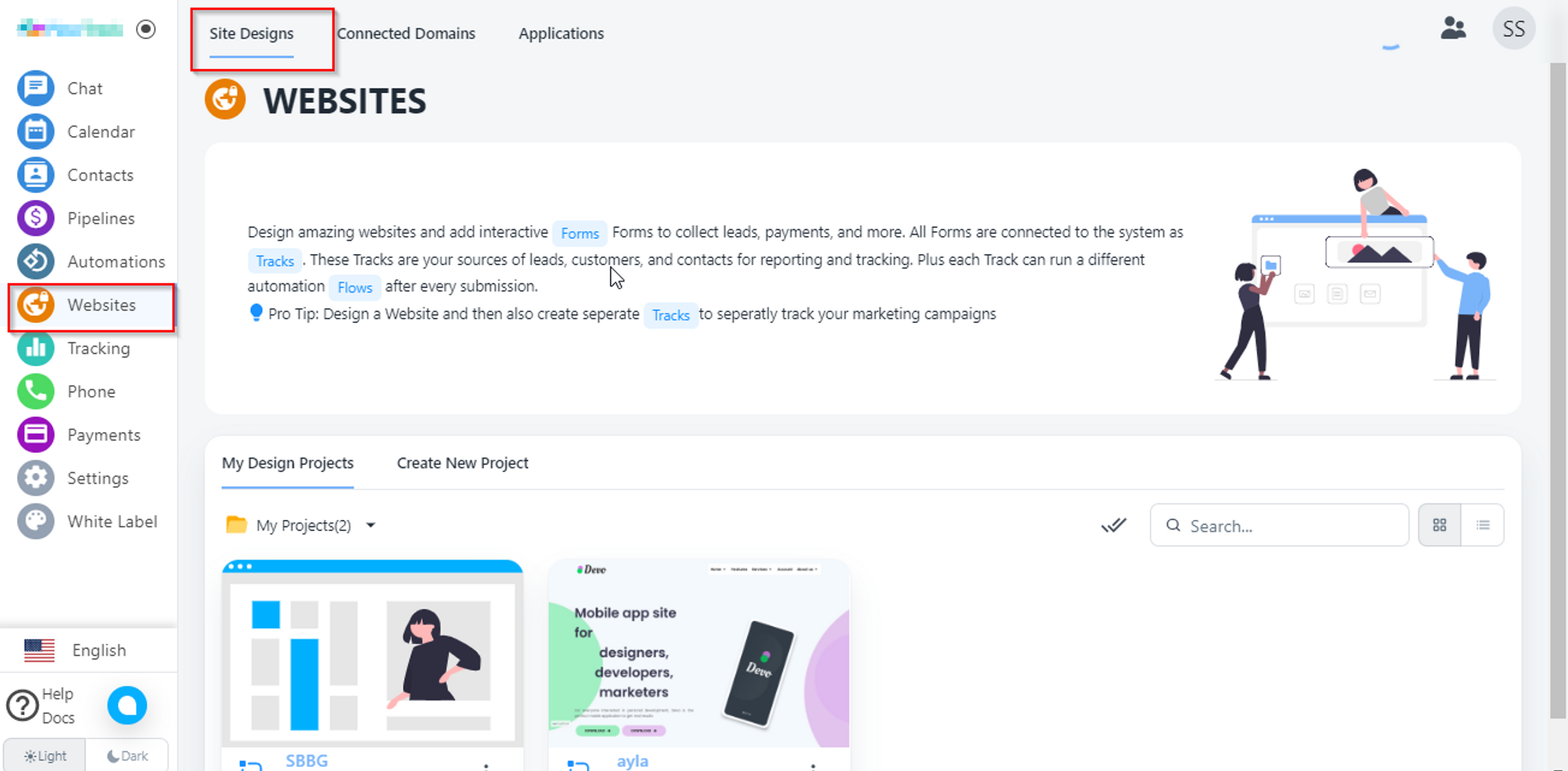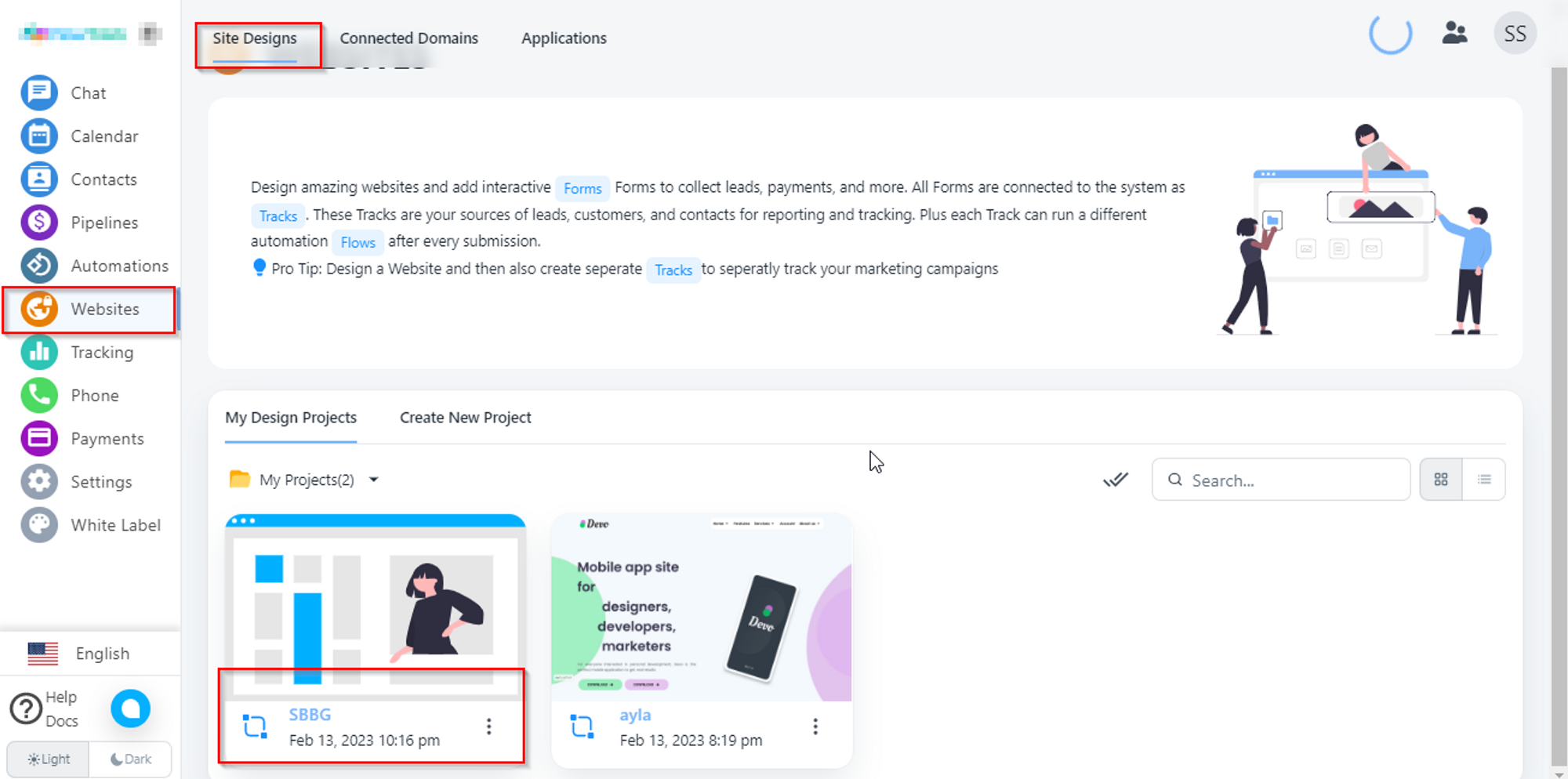 First, you need to click on Websites from the left bar menu then click on the Site Designs option.