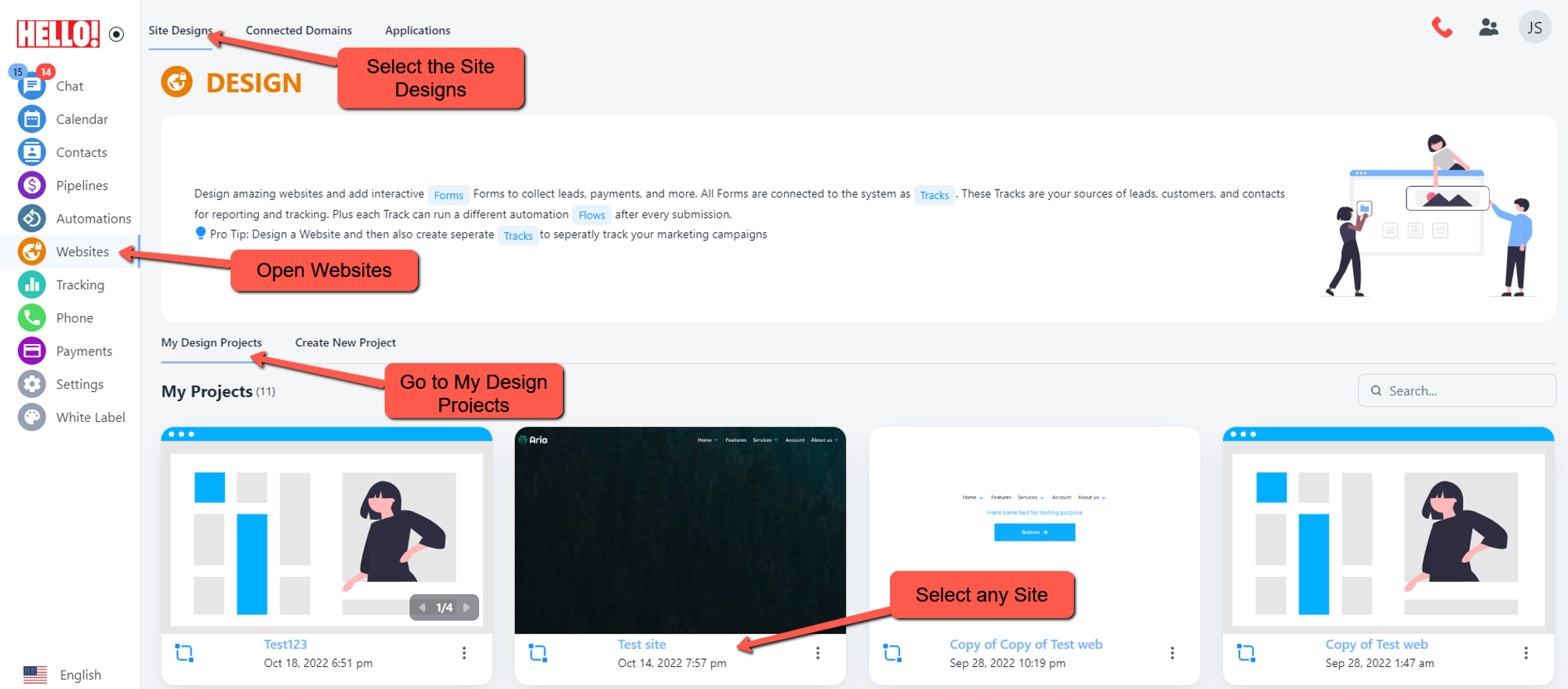 Select the websites from the navigation bar, go to Site Designs and to My Design Projects, select any of the site that you want.