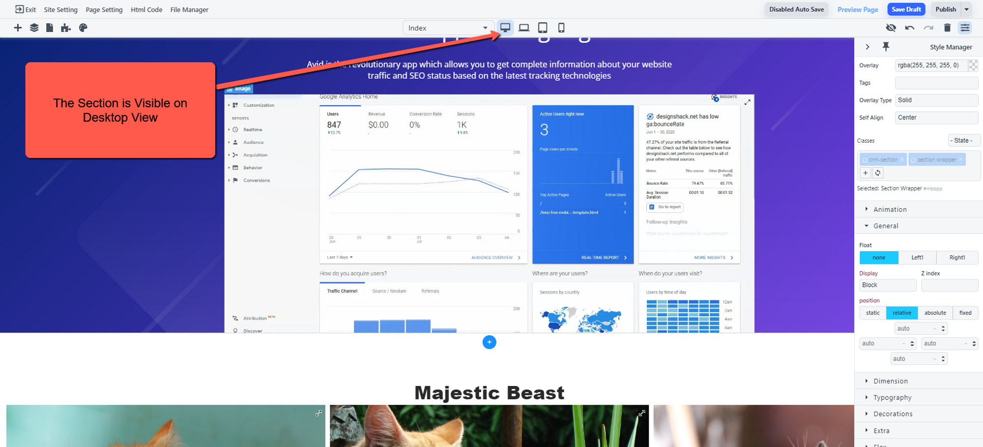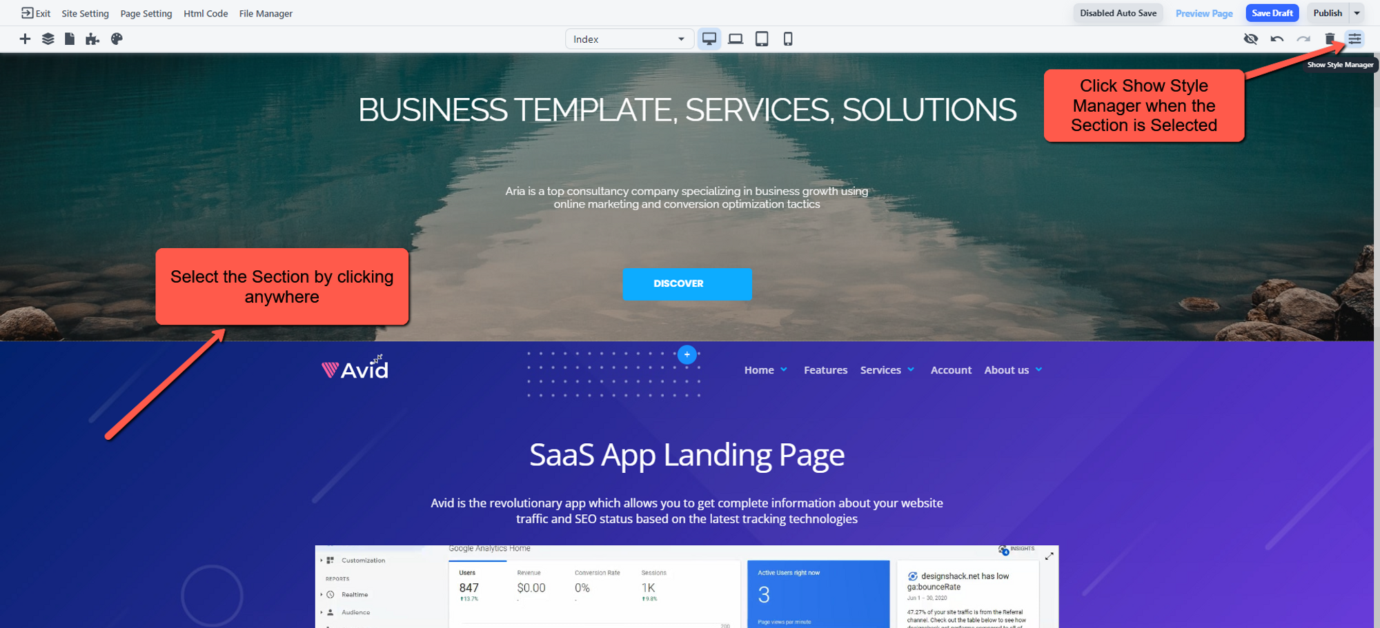 Click anywhere on the screen to select the Section and Select the Menu button to Show Style Manager.