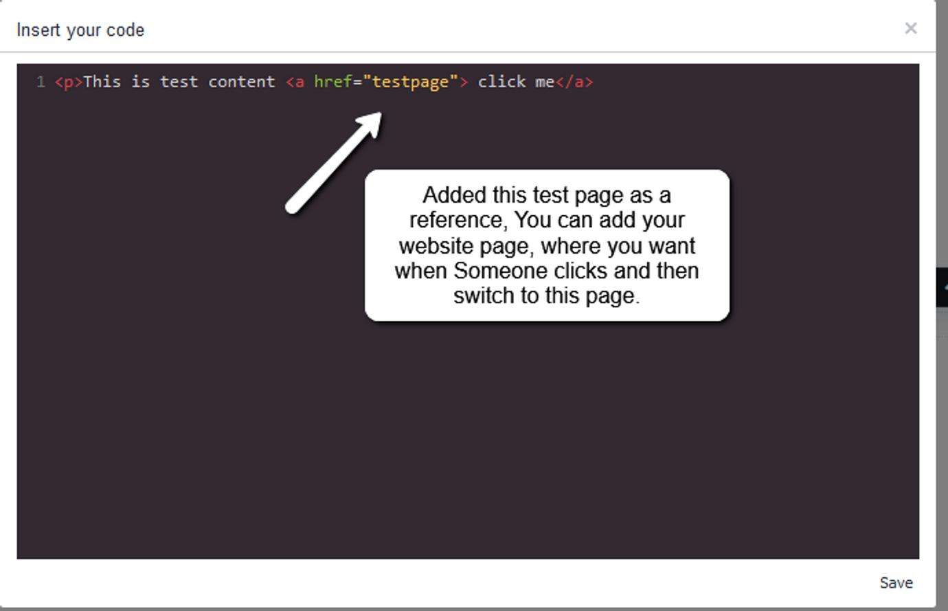 Code: <p>This is test content <a href="testpage"> click me</a>